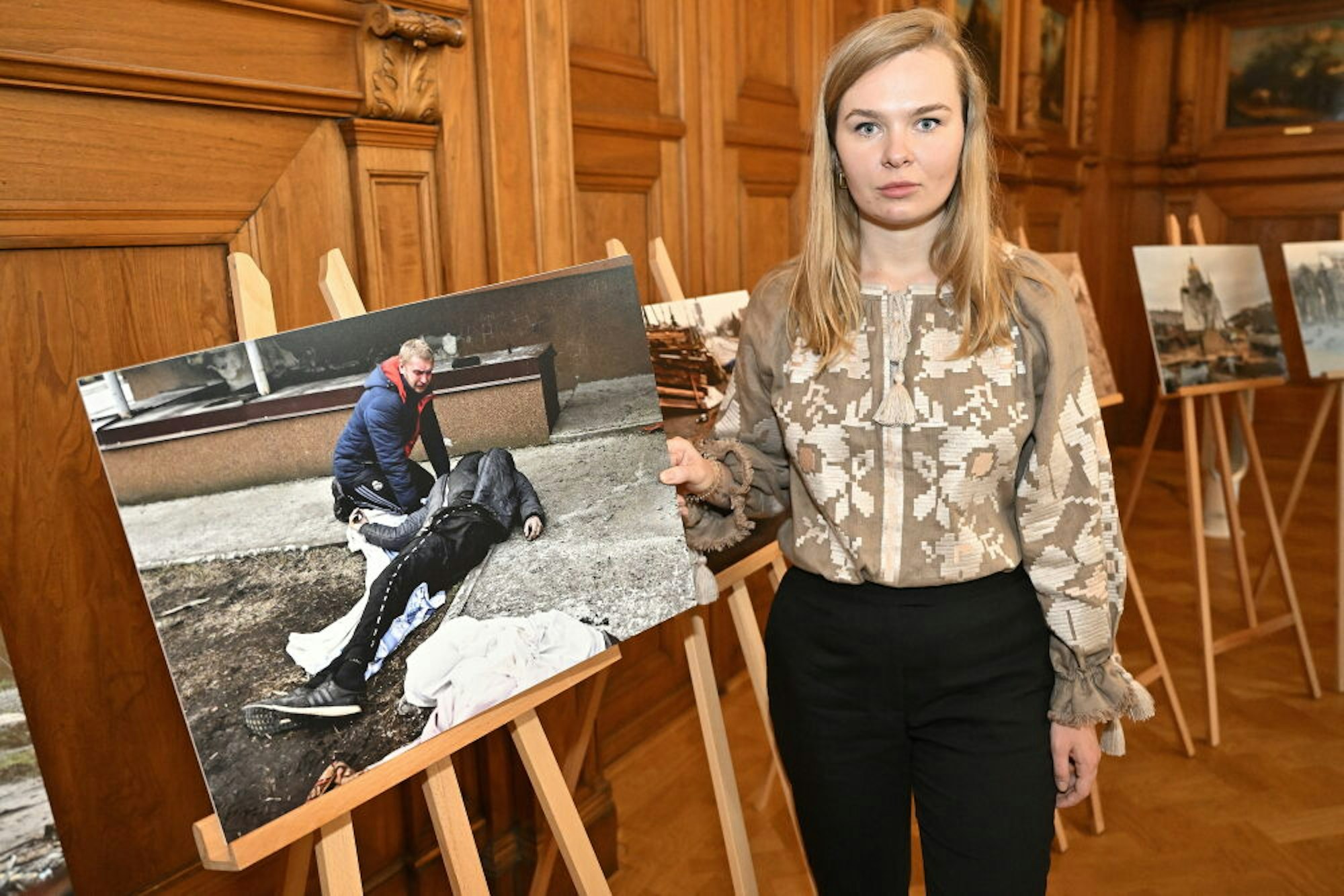 „Mehr als 400 Zivilisten sind getötet worden, viele von ihnen auf offener Straße erschossen“, erzählt Alina Saraniuk. „Und dann haben die russischen Soldaten verboten, die Toten zu bestatten. Erst Tage später konnten die Angehörigen zu den Getöteten auf die Straße. So wie dieser Sohn, der seinen Vater gefunden hat“, sagt die 26-Jährige und zeigt auf eins der 29 Pressebilder im Gladbacher Ratssaal, das sie besonders berührt.