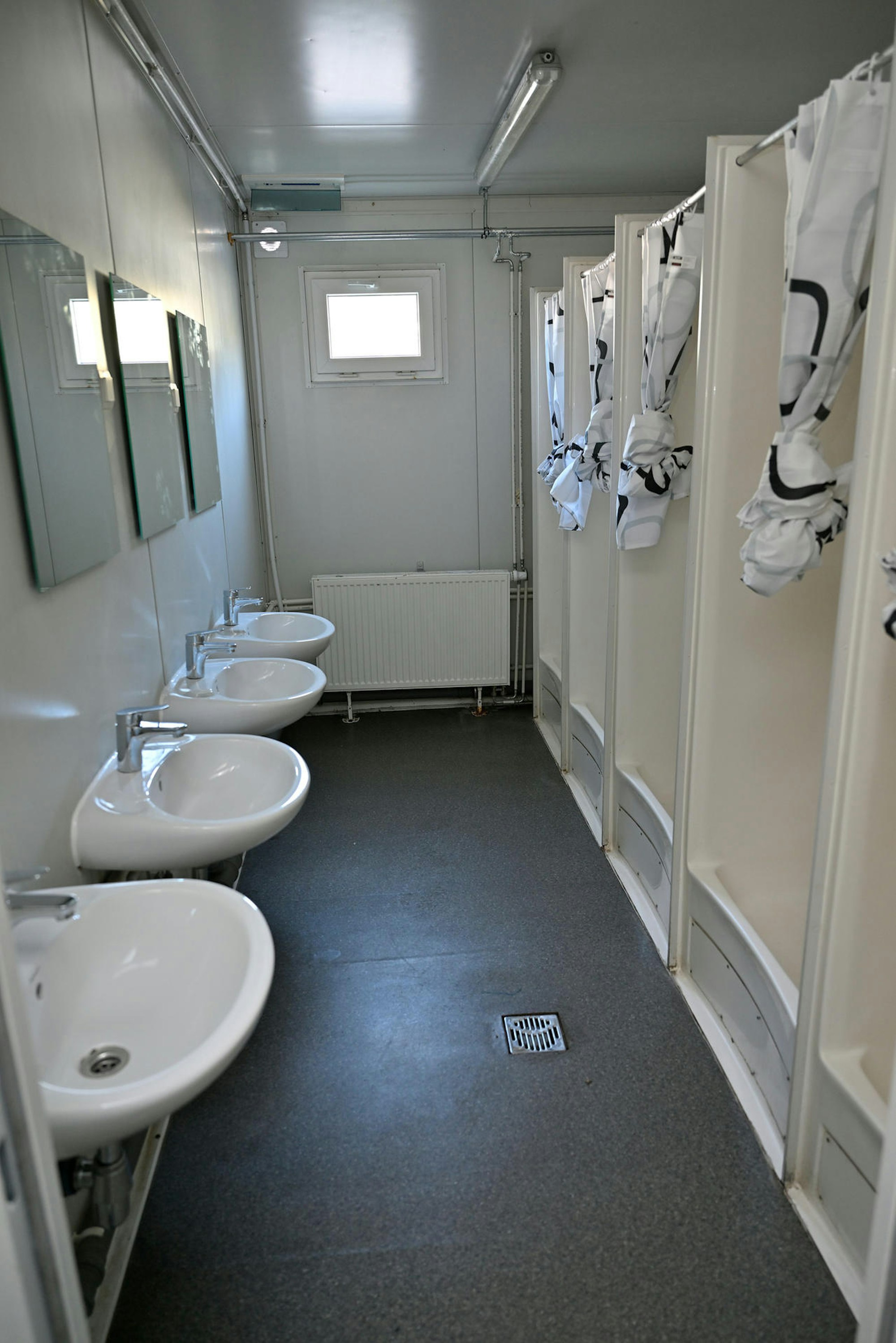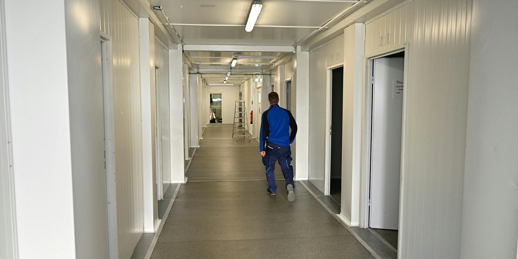 Die Zimmer wirken gestern morgen noch trostlos kahl. Das soll sich schon am Nachmittag ändern, wenn mit Hilfe der Feuerwehr im Akkord die Möbel aufgebaut werden. Dazu gibt es auf jeder Etage einen Aufenthaltsraum, einen Waschraum mit Waschmaschinen sowie getrennt für Frauen und Männer Duschräume und Toiletten. Wichtige Orte werden wohl auch die beiden Gemeinschaftsküchen sein. Die Herde und Kühlschränke werden noch geliefert. Ein separater Dusch-Wohncontainer für Corona-Infizierte wird noch aufgebaut, berichtet Dieball.