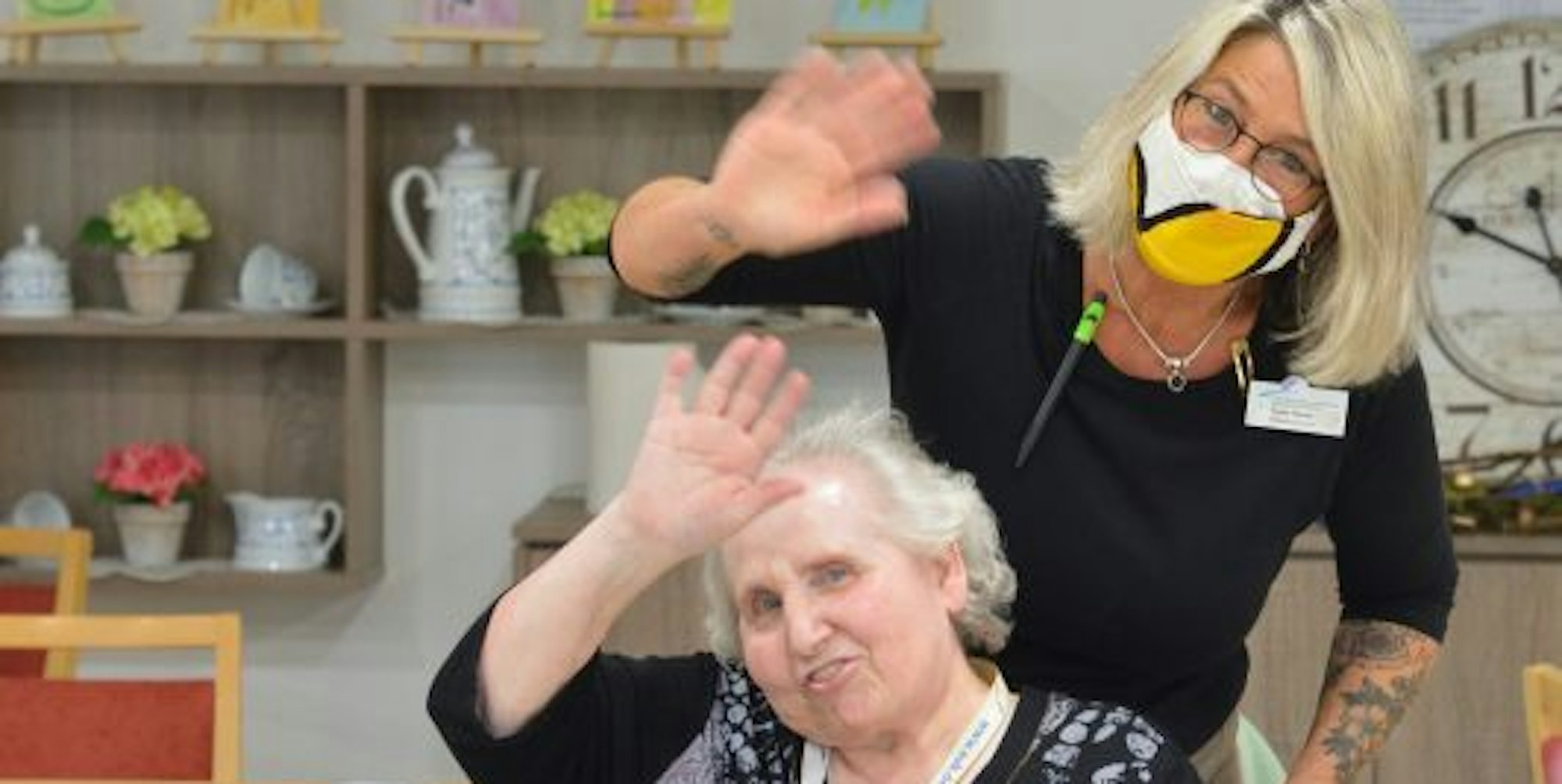 Dass sie eine der ersten Besuchsgelegenheiten nutzen würde, war Ingrid Höller schnell klar, „obwohl ich nicht weiß, ob es gut ist, dass die Heime schon so früh geöffnet werden.“ Die Freude ihrer Schwester, die von ihren Versuchen beim Dartspielen berichtet und stolz ihre Gewinne beim Bingo aufzählt, überlagert indes jeden Zweifel. Dass sich im „Separee“ nebenan gerade der zweite Teil der Familie befindet, lockert die Atmosphäre trotz des vorgeschriebenen sterilen Ambientes.