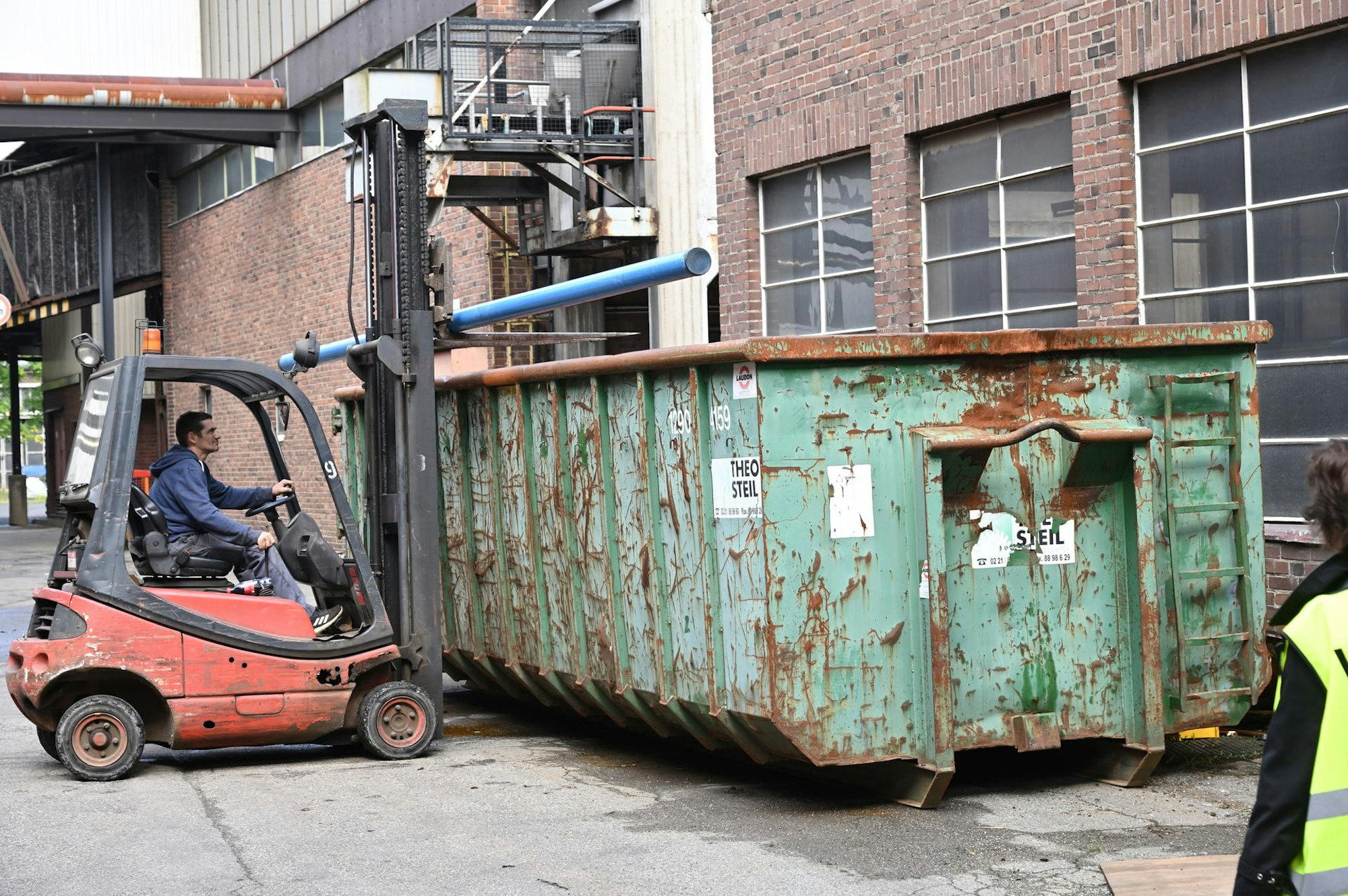 Ein Gabelstaplerfahrer verlädt altes Inventar und Gerätschaften aus den leeren Fabrikhallen. Schrotthändler haben es ersteigert.