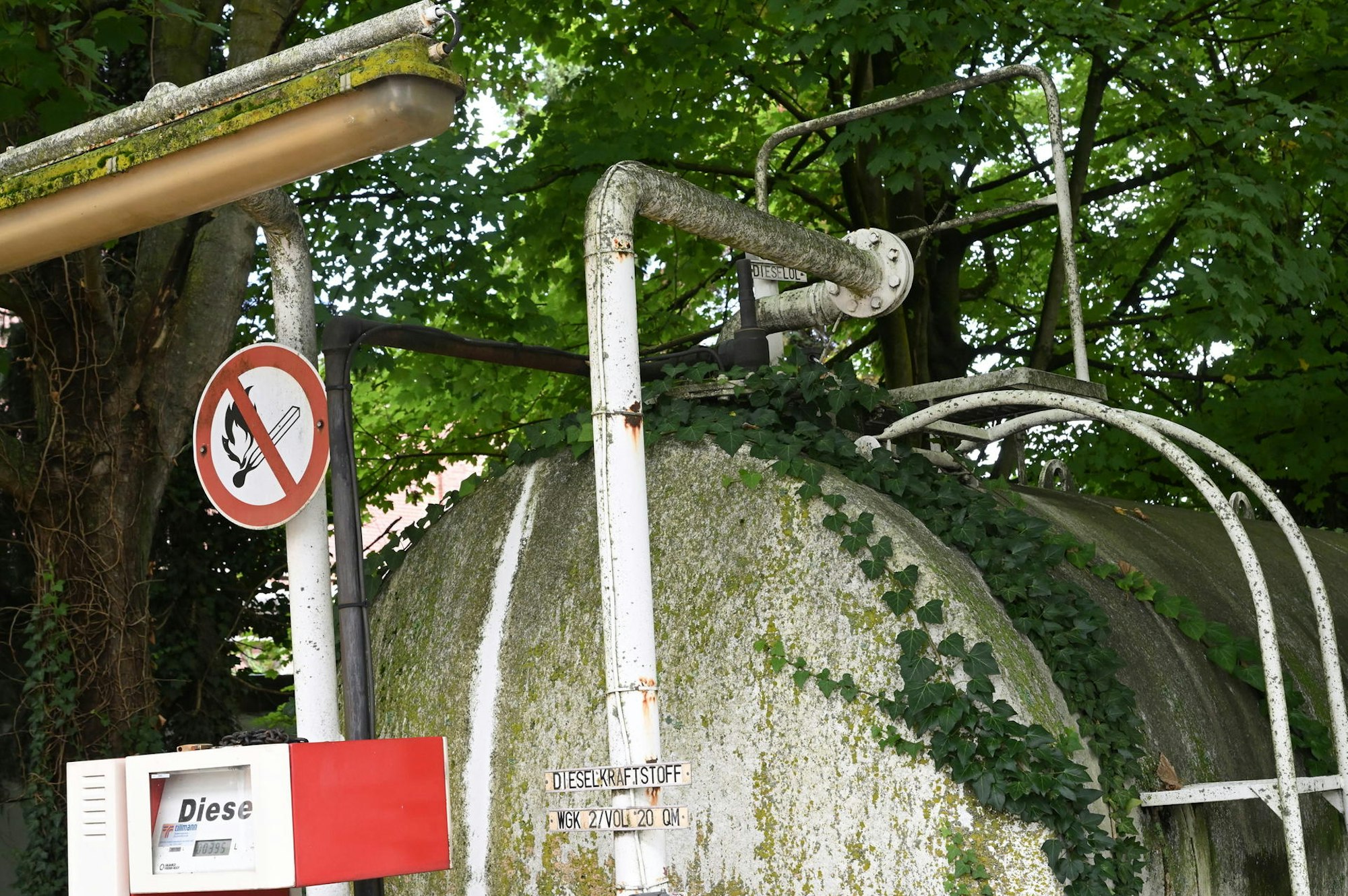 Die firmeneigene Tankstelle steht noch auf dem Gelände.