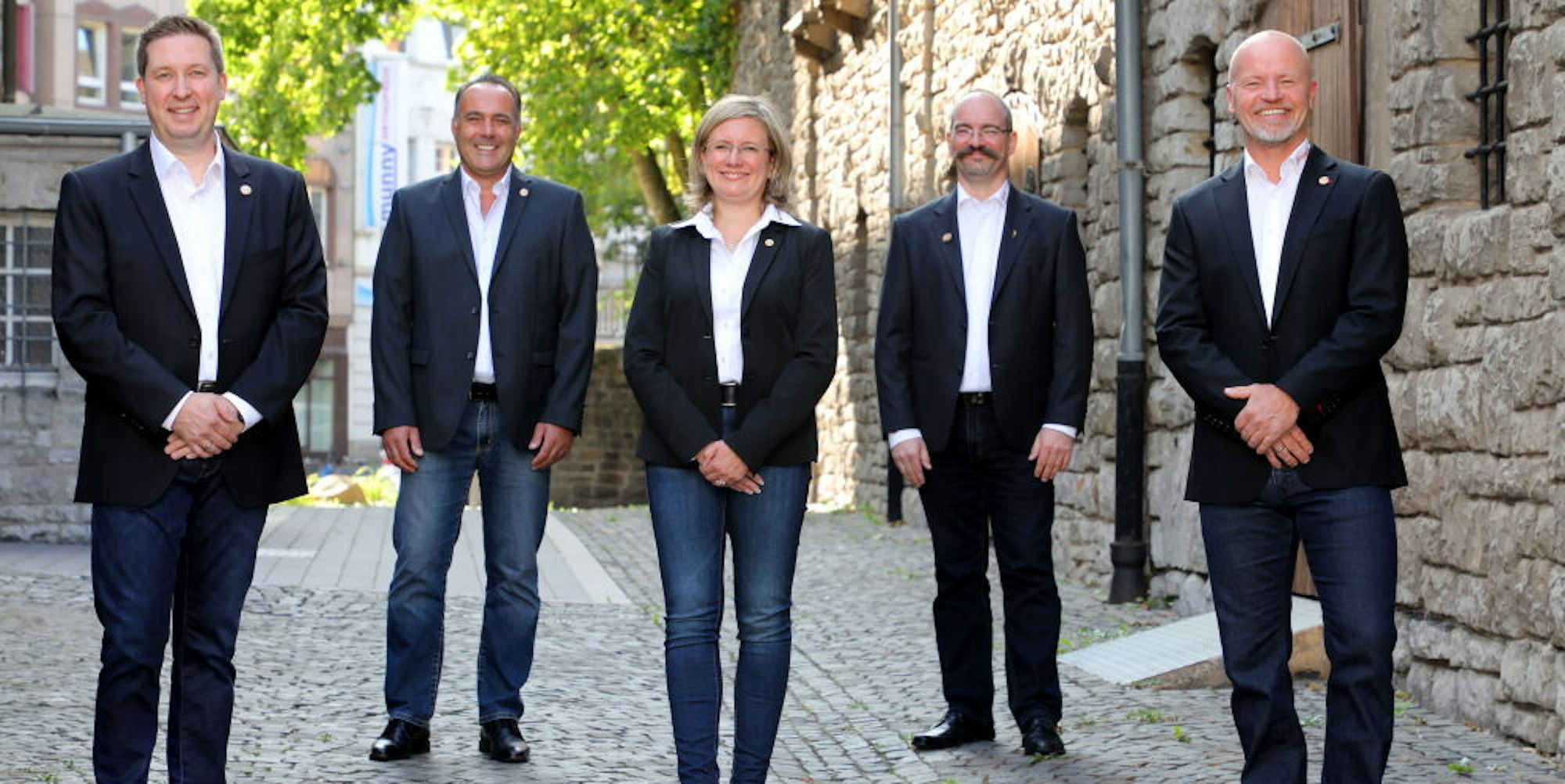 Erstes geheimes Foto mit Abstand im Schatten des Rathauses: (v.l) Prinz in spe Frank Haag, Prinzenführer Frank Mehren, die designierte Jungfrau Melanie Pfister, der Präsident der Großen Gladbacher KG, Alexander Pfister, und der Bauer fürs Dreigestirn 2022, Andreas Rossa.