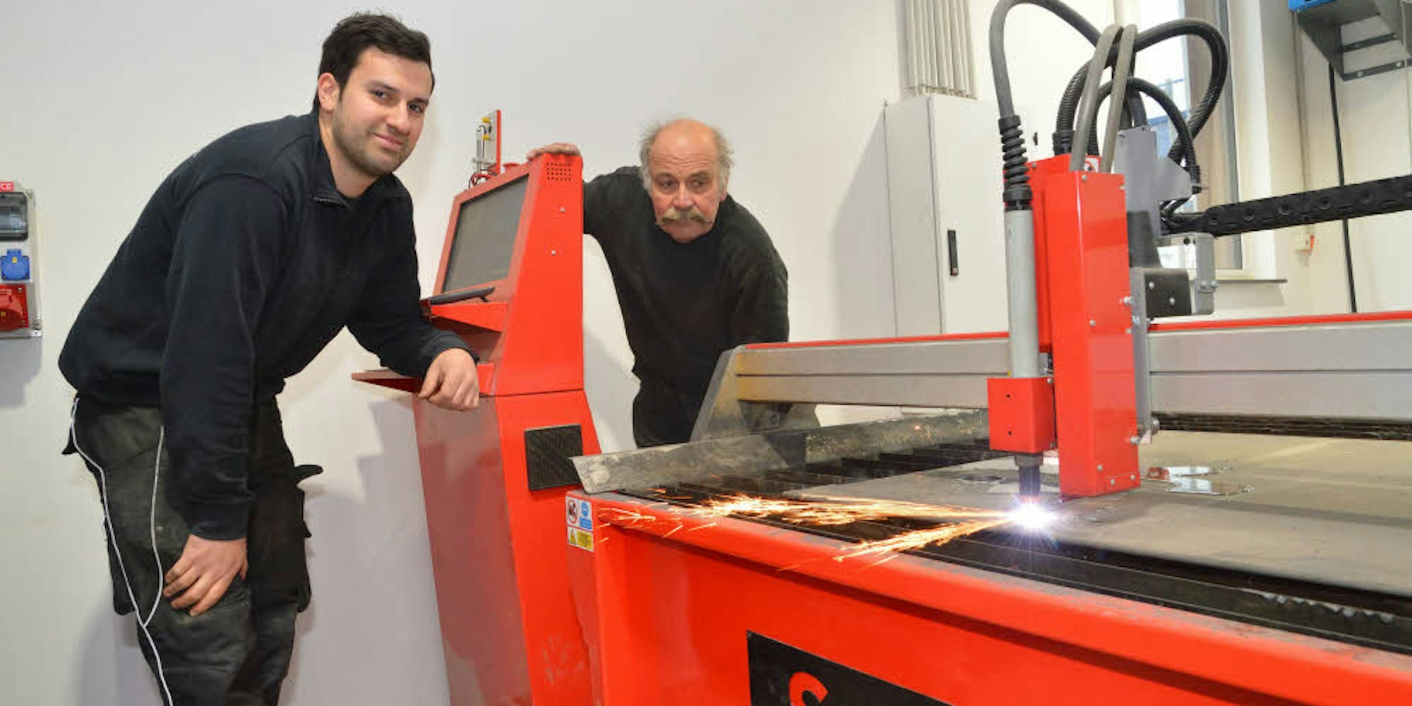 Paul und Walter Kellermann (r.) lassen bis zu 20 Millimeter dicke Blechplatten von einer computergesteuerten Schneidemaschine bearbeiten.
