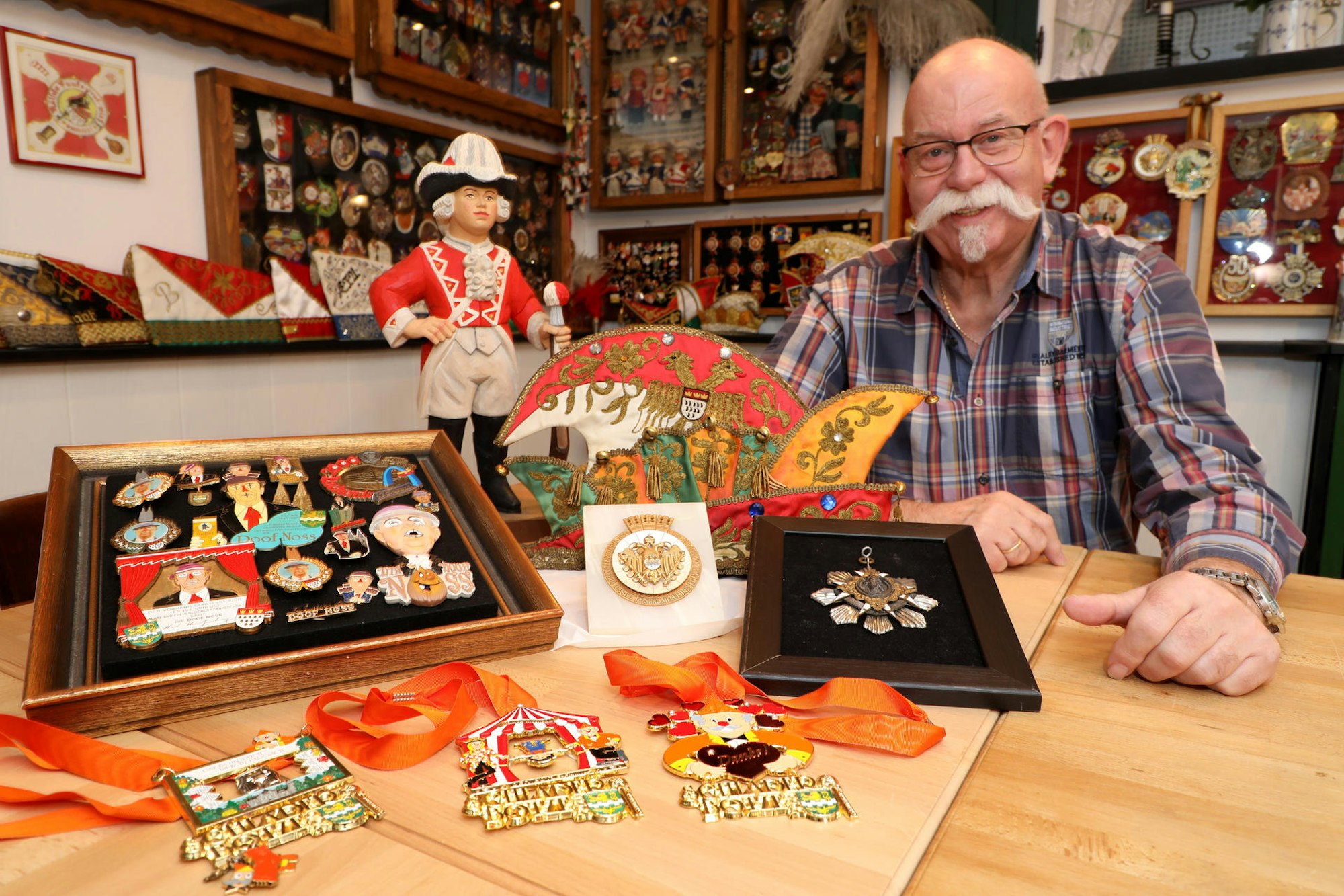 Bernd Hachenberg ist schnell in einer anderen Ecke seiner Sammlung: Ein Gewehr der Altstädter ist dort zu sehen, ein Säbel der Roten Funken und eine Kölner Prinzenmütze von 1951. „Mein Geburtsjahr“, sagt der Sammler augenzwinkernd. Manchmal schaltet er kleine Anzeigen auf der Suche nach seltenen Orden. Im Laufe der Jahrzehnte ist er zudem gut vernetzt, hat aus Nachlässen schon ebenso ungezählte Orden erhalten wie er Schmuckstücke auf Flohmärkten entdeckt hat.