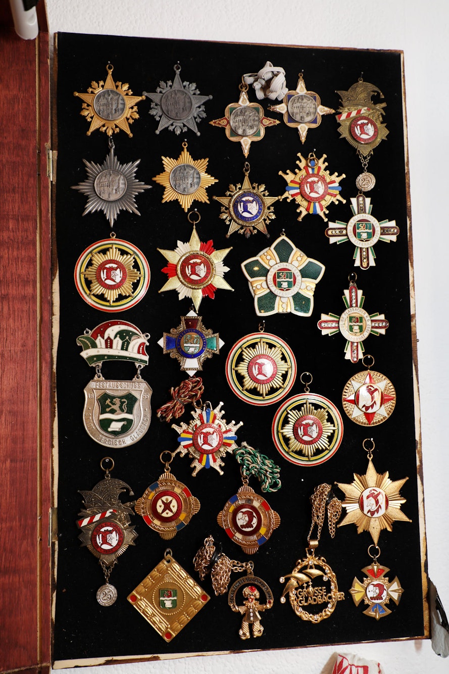 Einzige Ausnahme: ein opulentes Gemälde des Kölner Rosenmontagszugs 1906. Das hat einen Ehrenplatz im Obergeschoss erhalten. Mindestens genauso stolz ist Bernd Hachenberg unterdessen auf seltene Exemplare Gladbacher Orden, wie eine Rathaus-Edition aus den 1920er Jahren. „Da spiegelt sich die ganze Geschichte des Karnevals wider“, sagt Hachenberg und denkt bereits daran, wie diese Geschichte weitergeschrieben wird, „Die Idee für den Orden zu unserem 66-Jährigen in zwei Jahren habe ich schon“, sagt er augenzwinkernd.