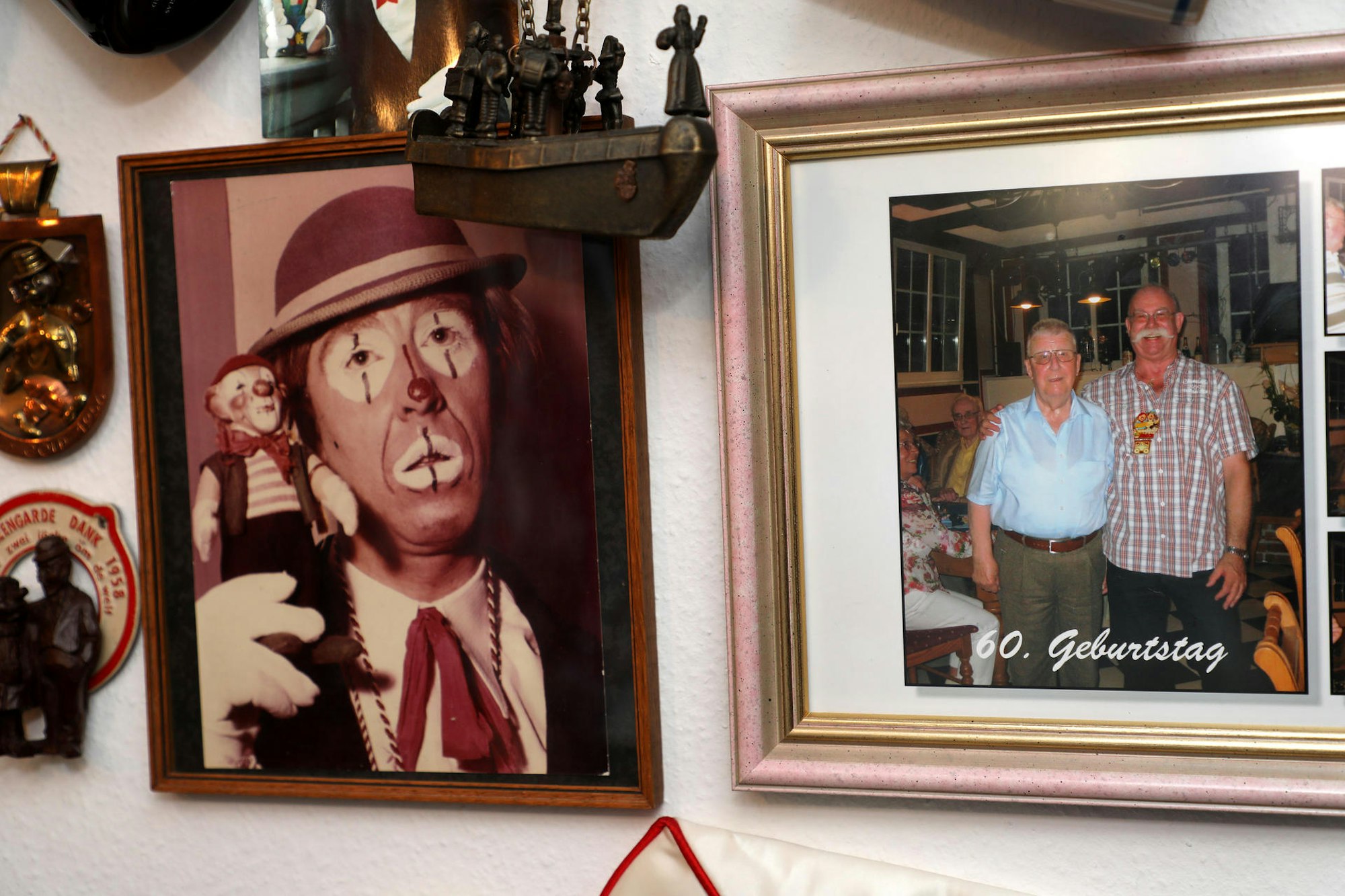 „Der älteste Orden ist von der Gesellschaft »Die Große von 1823« und stammt aus dem Jahr 1896“, sagt Hachenberg und nimmt ein – verglichen mit aktuellen Orden – eher unscheinbares Exemplar in einem Rahmen von der Wand. „Hier hängt das Festkomitee, hier der Treue Husar und da die Kölnische KG“, gibt er dem Besucher einen Überblick über die ungezählten glänzenden Schmuckstücke in Vitrinen und Rahmen. Die haben eine Grenze im Hachenbergschen Haus. Mit seiner Frau Karoline, die ebenfalls karnevalsjeck und in dieser Session seit 22 Jahren bei den Schlader Botze ist, hat Bernd Hachenberg eine Abmachung: „Karneval an den Wänden nur bis zur Oberkante des Kellergeschosses“, sagt Karoline Hachenberg lächelnd.