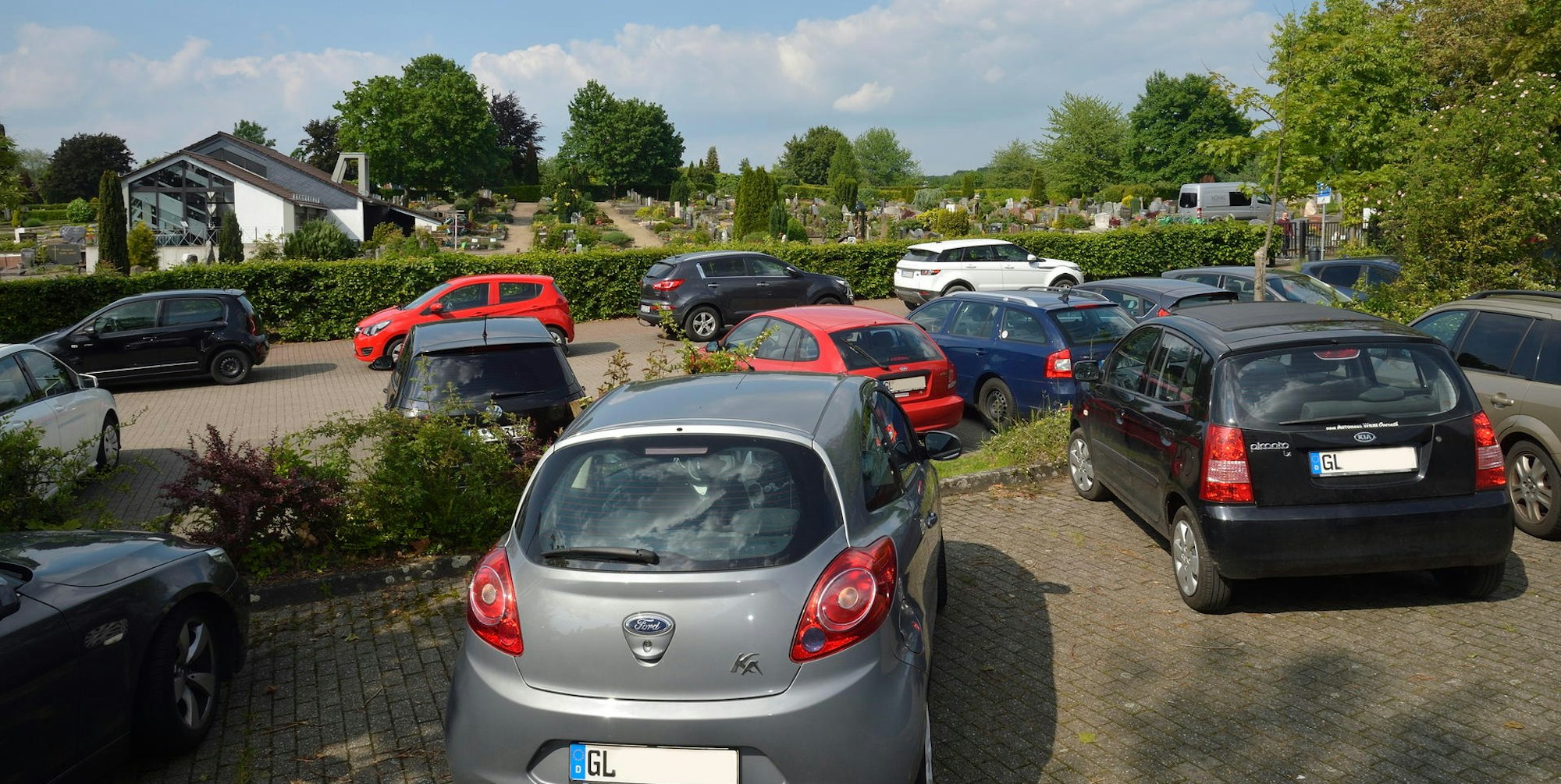 Parkende Autos vor dem Friedhof in Paffrath