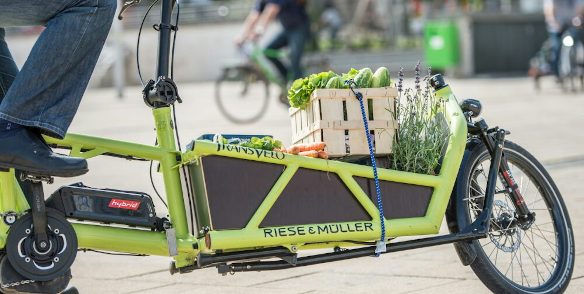 Ein Radfahrer transportiert mit seinem Elektro-Lastenrad Gemüsekisten. (Symbolbild)