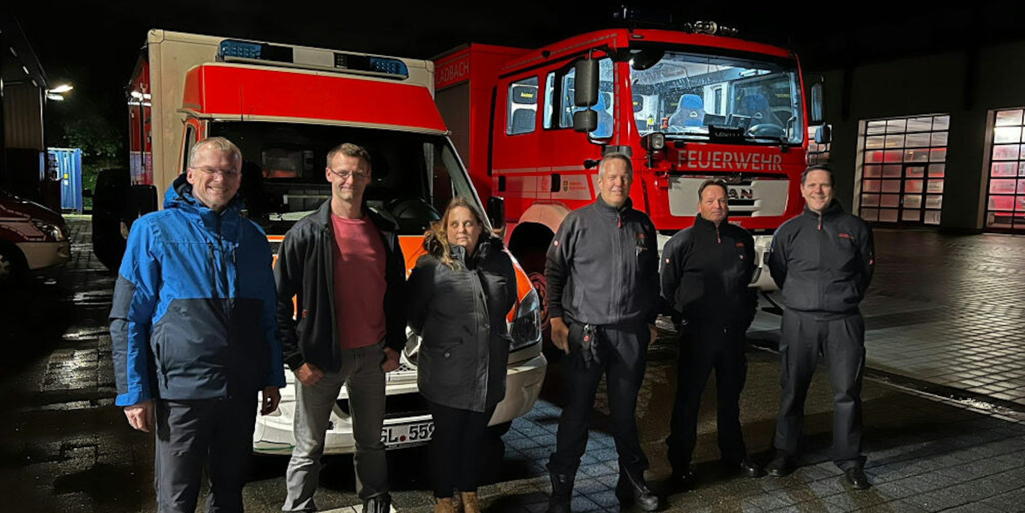 Vor der Abfahrt der ersten Gladbacher Einsatzfahrzeuge in der Nacht auf Freitag: (v.l.) Bürgermeister Frank Stein, die „Überführer“ Dominic Lülff, Angelina Esser-Lülff, Stefan Krill und Udo Steingass sowie der Leiter der Feuerwehr, Jörg Köhler.