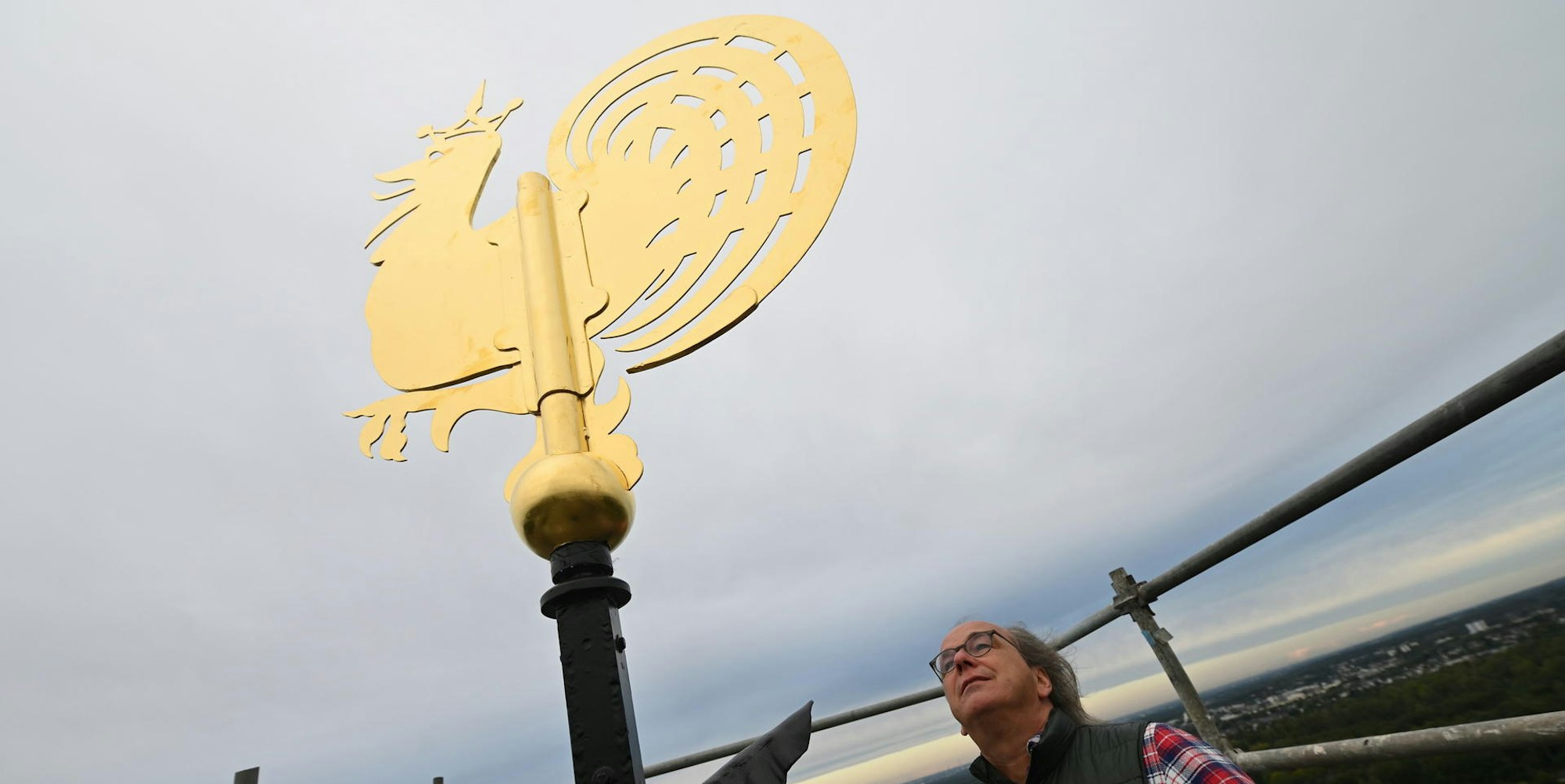 Wetterhahn frisch vergoldetTurmdach von St. Nikolaus in Bensberg ist fertig saniert