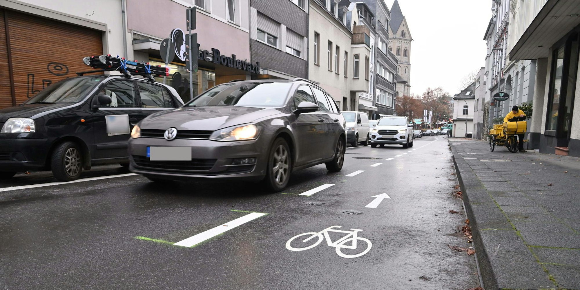 Wie geht es weiter? Derzeit läuft Stufe eins: die Öffnung der Straße für Radfahrer, auch im Einbahnstraßenbereich. Ein Schutzstreifen harrt der Vollendung. Anfang Januar sollen letzte Markierungen kommen. Wetter und Ferien hätten verzögert, berichtet Sprecher Martin Rölen. 14 Parkplätze fallen weg.