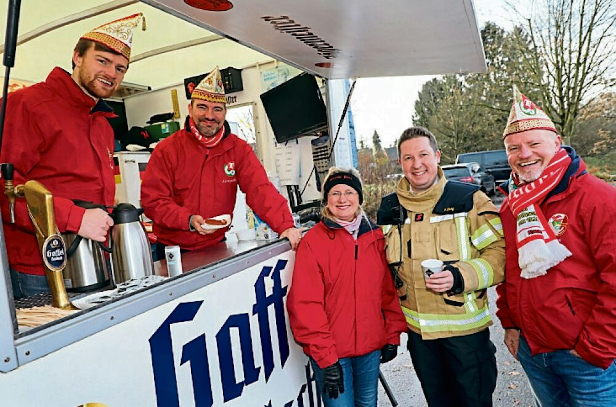 Kaffee und Würstchen bietet die Große Gladbacher KG mit ihrem designierten Dreigestirn um Vize-Feuerwehrchef Frank Haag (2.v.r.) an.