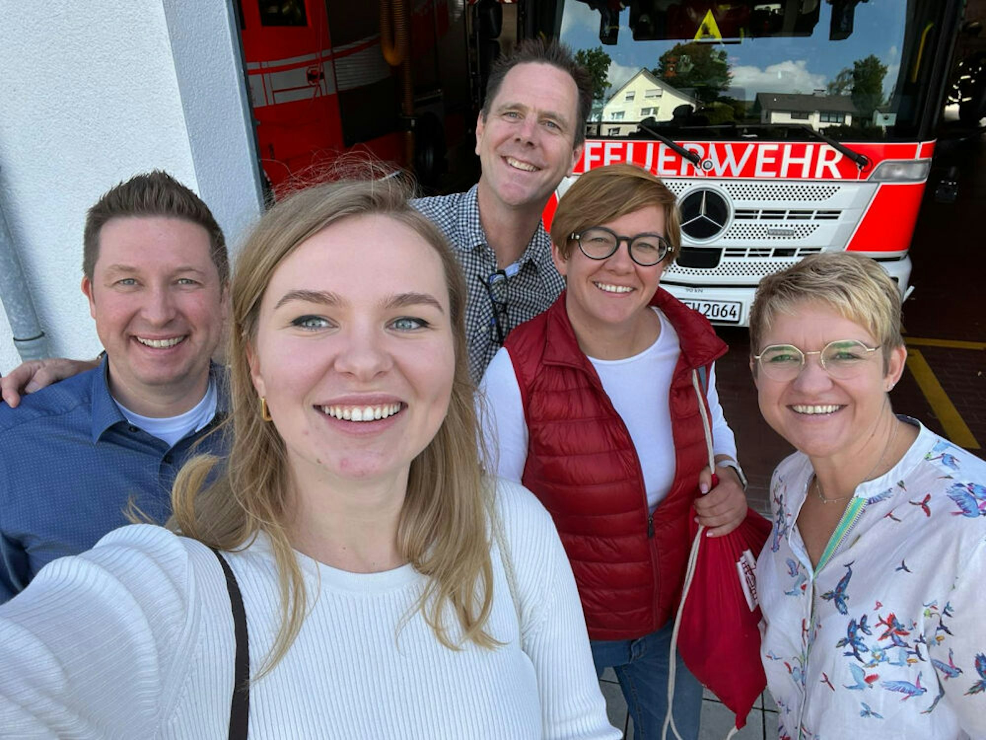 Ein Selfie zum Abschied: (v.l.) Frank Haag, Alina Saraniuk, Jörg Köhler, Mykhailyna Skoryk-Shkarivska und Nicole Haag bei der Feuerwehr.