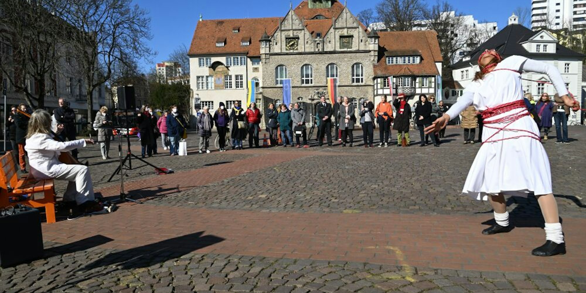 Was „Frau Sein“ im Jahr 2022 bedeuten kann, zeigten die beiden Künstlerinnen Bibiana Jiménez und Marei Seuthe bei einer Musik- und Tanzperformance auf dem Konrad-Adenauer-Platz. „Frauen bekommen für gleiche Arbeit oft weniger Geld als ihre männlichen Kollegen, Frauen sind noch zu wenig in Führungspositionen vertreten und werden in der ganzen Welt auch heute noch ungleich behandelt“, resümierte Gleichstellungsbeauftragte Judith Klaßen in ihrem gemeinsamen Grußwort mit Frank Stein.