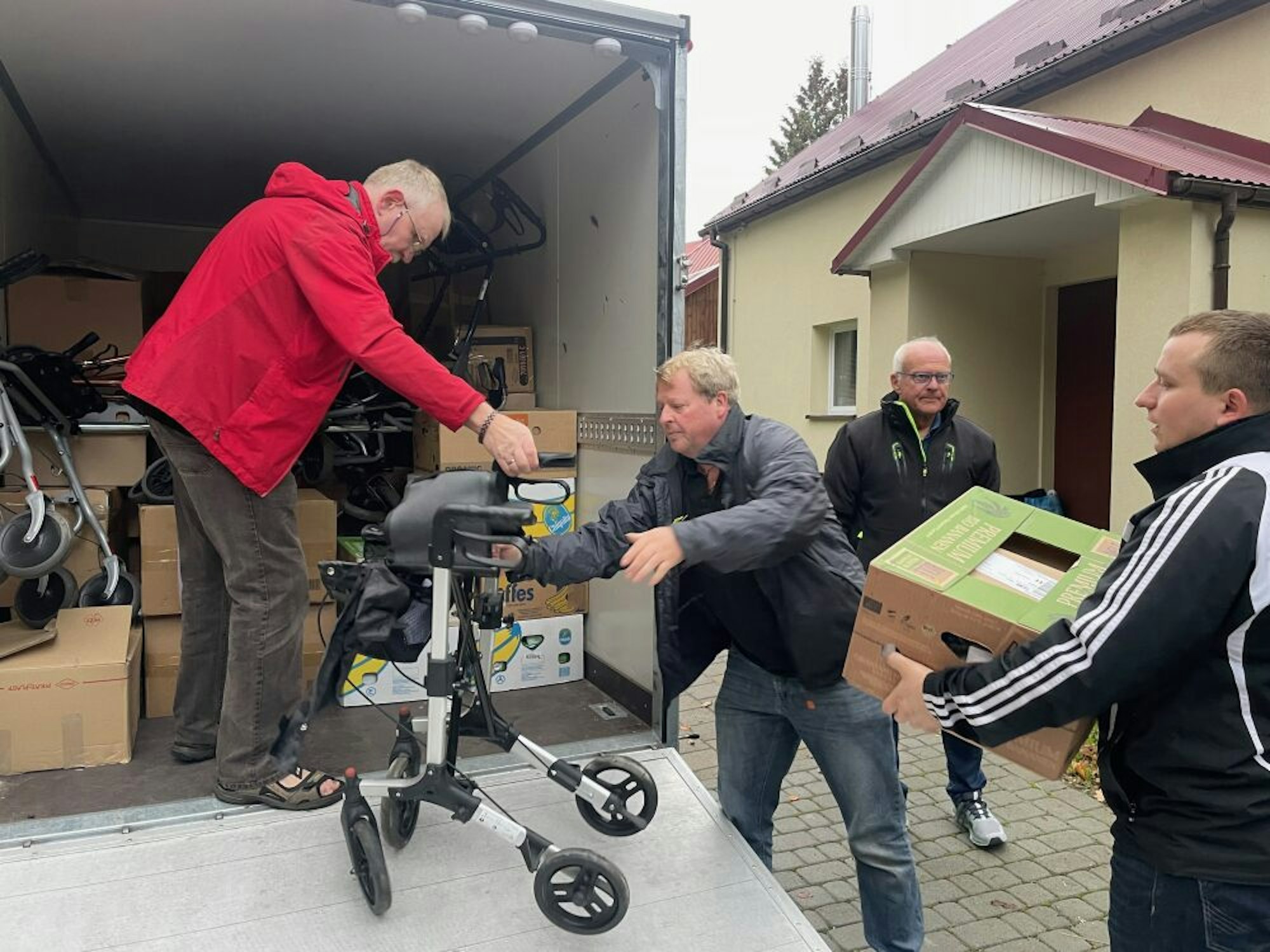 Auch Rollatoren zählen zu den Hilfsgütern, die Dietmar Schur, Dirk Ballsieper und Guido Jansen am Ziel ausladen.