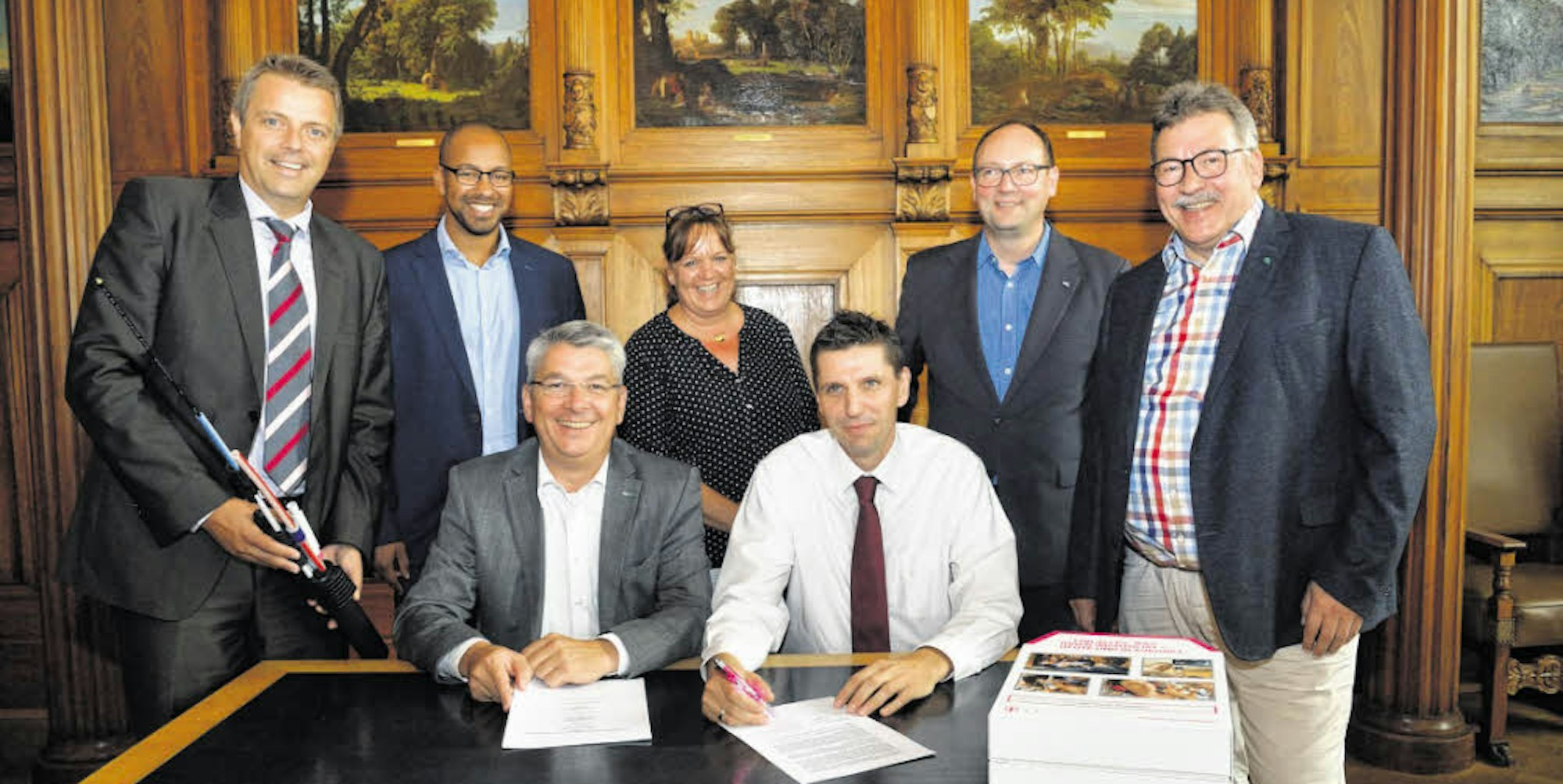 Fünf Millionen Euro werden bis 2021 investiert in die Breitbandoffensive. Bürgermeister Lutz Urbach (3.v.l.) und Telekom-Manager Marco Lohmeier (3.v.r.) unterzeichneten den Vertrag.