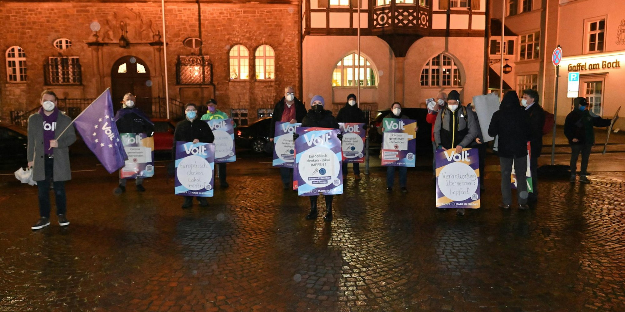 Mit Plakaten und einer ordnungsgemäß angemeldeten Demonstration bezogen die Volt-Mitglieder Position gegen den „Corona-Spaziergang“.