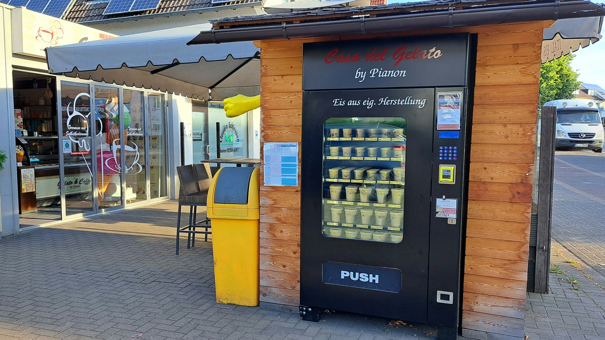 Das Eiscafé „Gelato & Caffe by Pianon“ des namensgebenden Patrizio Pianon in Bergisch Gladbach-Refrath ist eine gute Anlaufstelle, wenn sich der Eishunger mal zu ungewöhnlichen Zeiten meldet. Denn: Der Italiener bietet durch einen vor der Eingangstür stehenden Eisautomaten sozusagen einen 24-Stunden-Service für seine hausgemachten Eiskreationen an. Von Grüner Apfel bis Biscotto über Tartufo bis Mango dürfte in der Dolmanstraße 29 für alle etwas dabei sein.