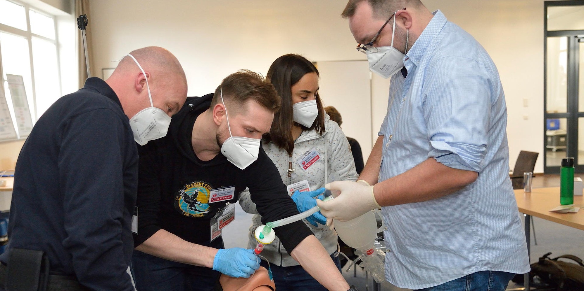 Die American Heart Association wendet sich mit ihren ACLS-Kursen an Ärzte, Pfleger, Feuerwehrleute und Notfallsanitäter. Die Teilnehmer üben das Legen von Kathetern, die Verabreichung von Medikamenten, die Atemwegssicherung und den Einsatz eines Defibrillators. Da die American Heart Association mit ihren Kursen weltweit engagiert ist, können auch Helfer, die sich bisher nicht kennen, aber solch einen Kurs absolviert haben, gut zusammenarbeiten. (job)