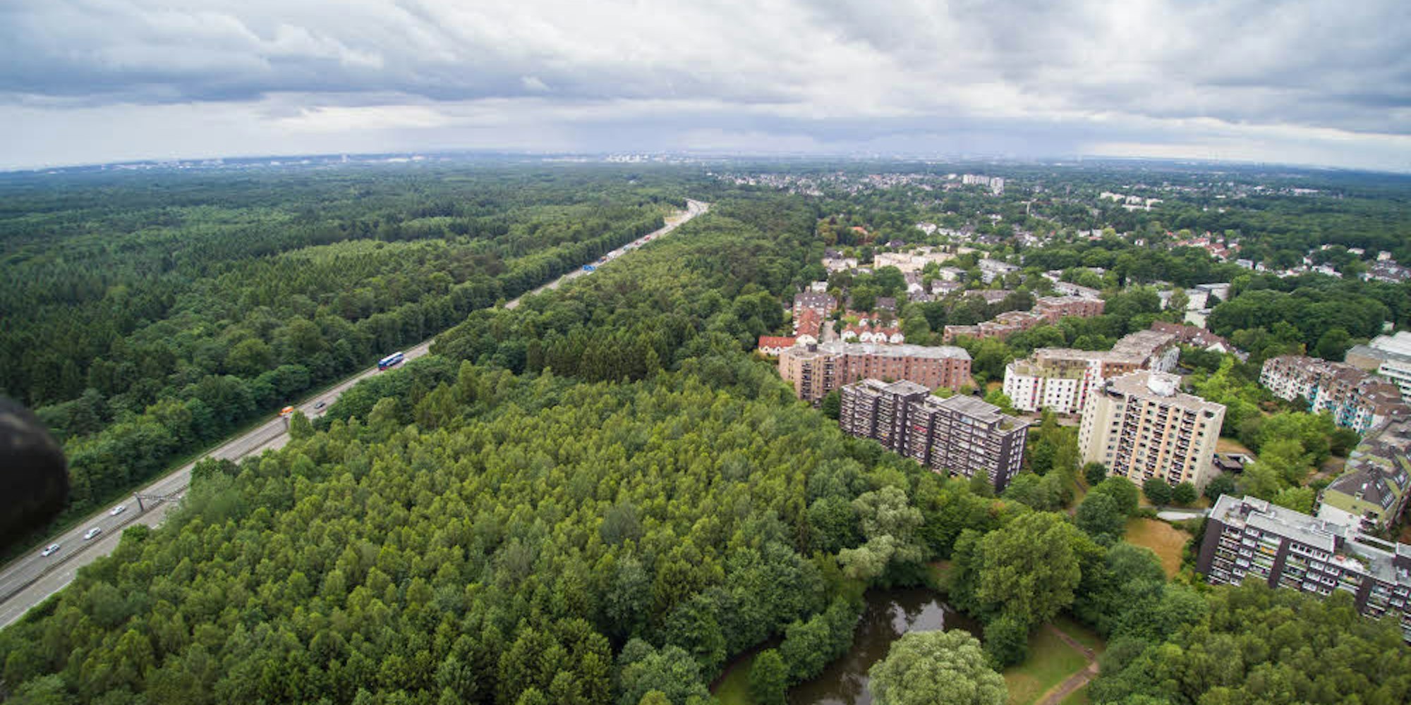 Neufrankenforst aus der Luft: Die „neue“ Brüderstraße soll sich unmittelbar rechts der Autobahn erstrecken, durch die Bäume von der Wohnbebauung abgeschirmt.