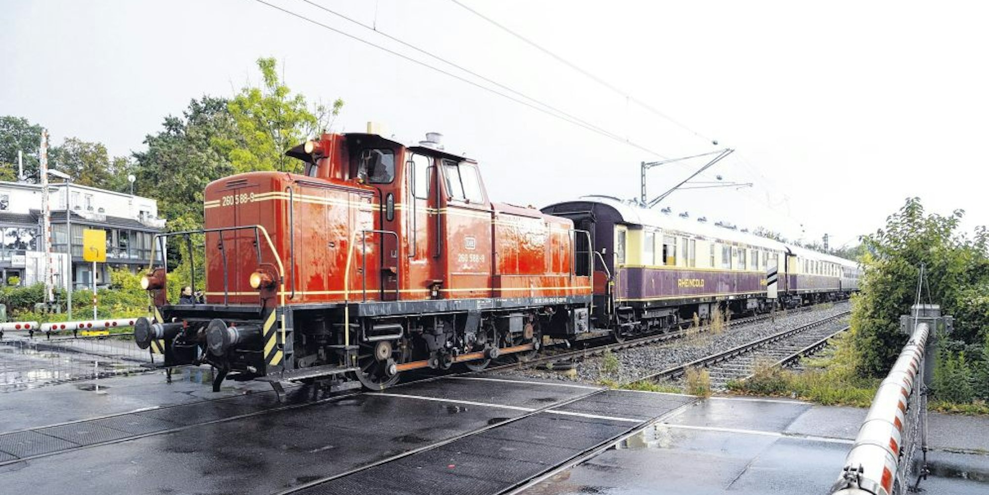 Der Sonderzug mit den Rheingold-Wagen überquert den Bahnübergang Tannenbergstraße.