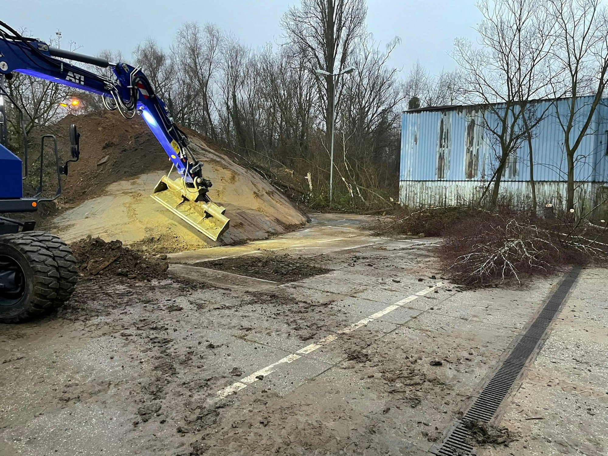 Ein Berg von zwischengelagertem Erdreich (links) musste für die neue Straße mit einem Bagger versetzt werden, mehrere um die Brandruine der Squash-Halle in 24 Jahren gewachsene Bäume mussten gefällt werden.