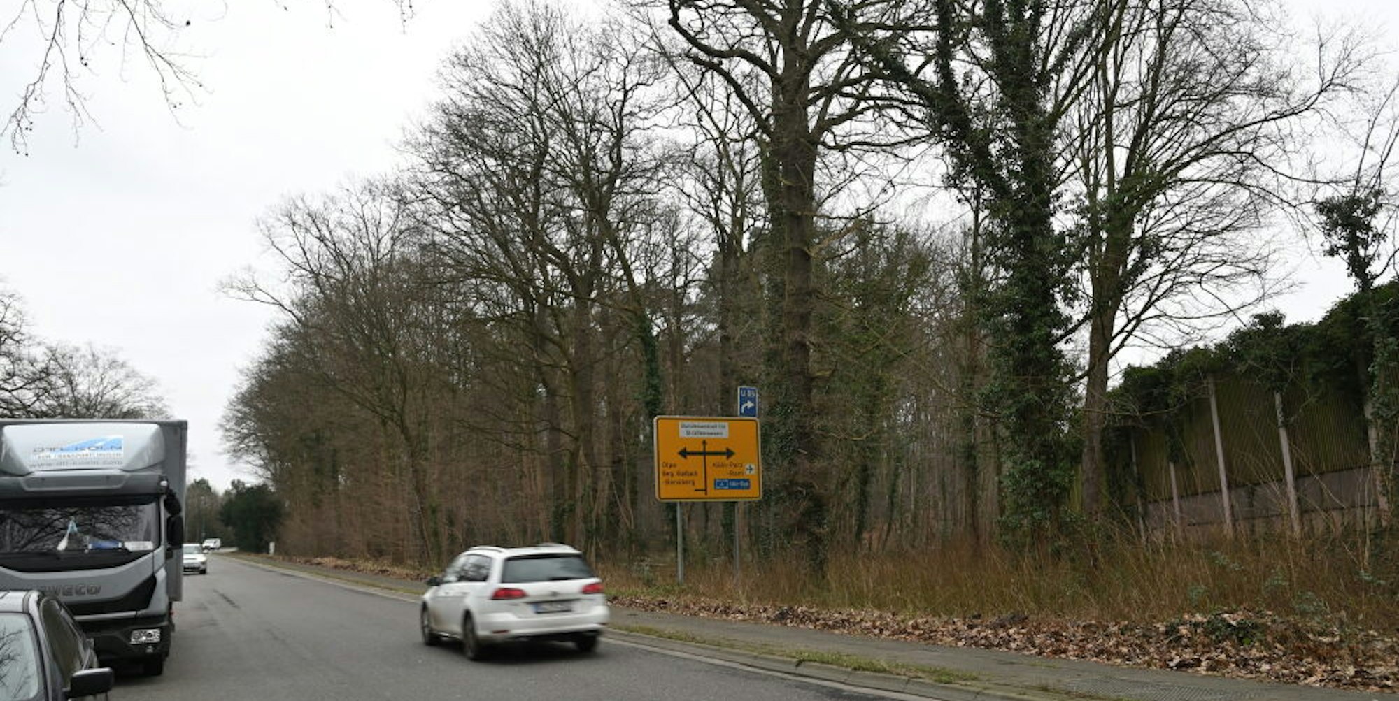 Das Waldstück, gesehen von der anderen Straßenseite. Auf knapp 8000 Quadratmetern soll hier die Feuerwache Süd gebaut werden.