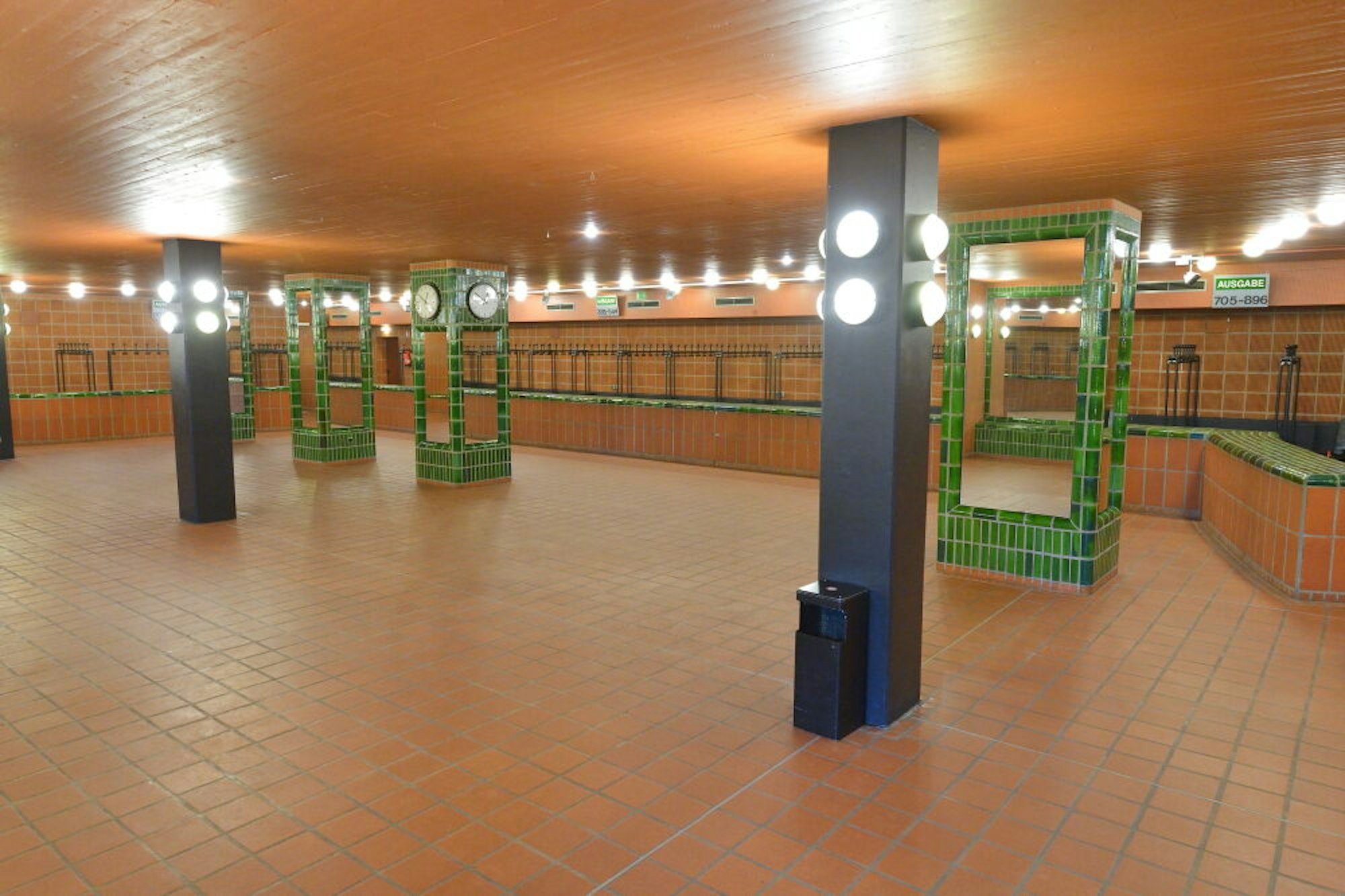 Das Gesamtkunstwerk sei konsequent durchkomponiert, Farben und Materialien seien bewusst gewählt, um Kontraste zu schaffen und einzelne Bauteile hervorzuheben, heißt es im Gutachten. Die dunkelroten Fassadenelemente stehen im Kontrast zum Dunkelgrün der Fensterrahmen und der grünen Fliesen, die Böhm extra für diesen Bau entwarf und in Hessen brennen ließ.