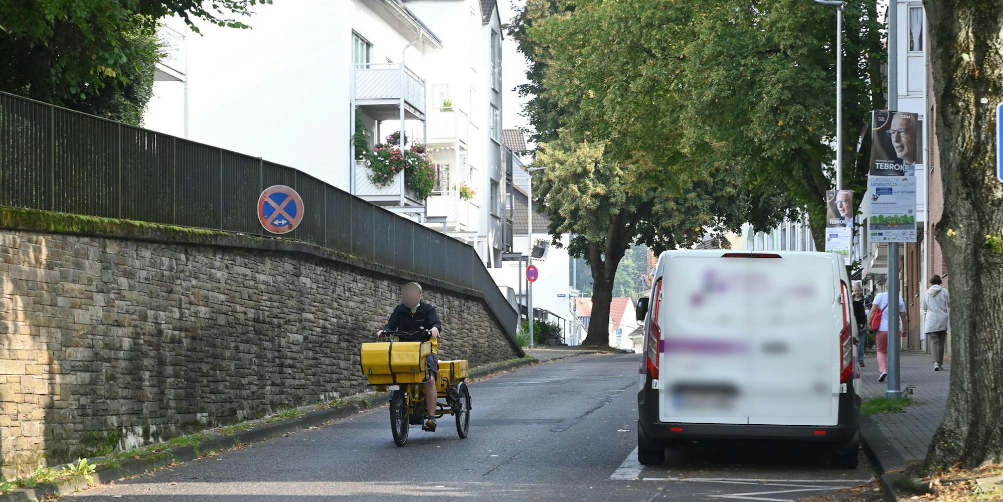 Wie zum Beweis fährt in diesem Moment eine Briefzustellerin auf ihrem Fahrrad vorbei, bergab gegen die Einbahnstraße. Das ist illegal, aber nicht mehr lange geht es nach den Plänen der Stadtverwaltung: Denn bis zum endgültigen Umbau zur Fahrradstraße soll die Laurentiusstraße in einem ersten Schritt noch in diesem Jahr für den entgegenkommenden Radverkehr geöffnet werden.
