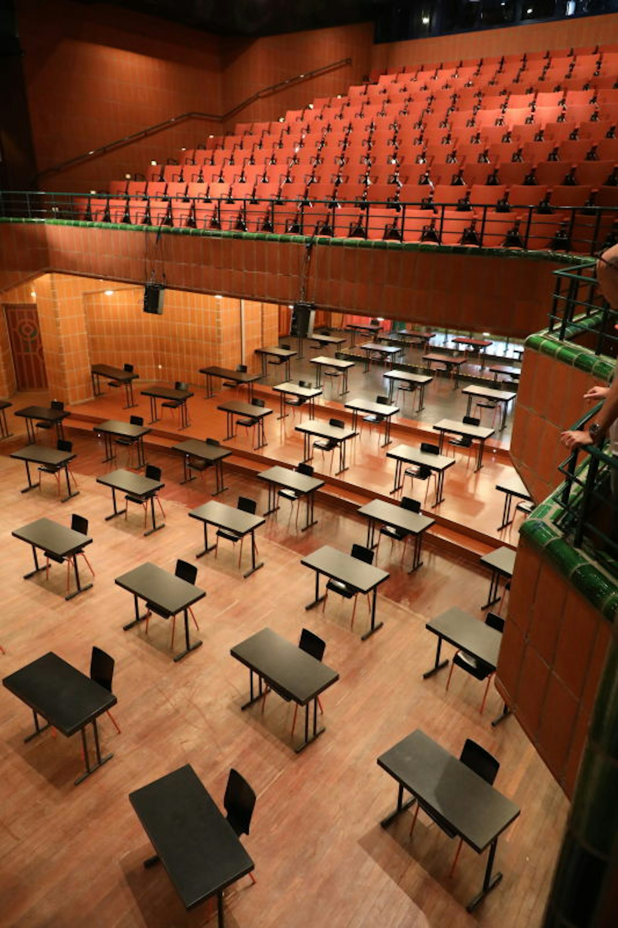 „Im Prinzip können wir den gesamten Bergischen Löwen als Studiobereich mit einbeziehen“, sagt Löwen-Geschäftsführer Norbert Pfennings und schaut auf die mit Abstand im Saal verteilten Einzeltische. Die stehen dort noch von den Prüfungen der Industrie- und Handelskammer, die auf der Suche nach geeignet großen Räumlichkeiten, um die Corona-Sicherheitsabstände einhalten zu können, ebenfalls auf das Gladbacher Bürgerhaus gestoßen war.