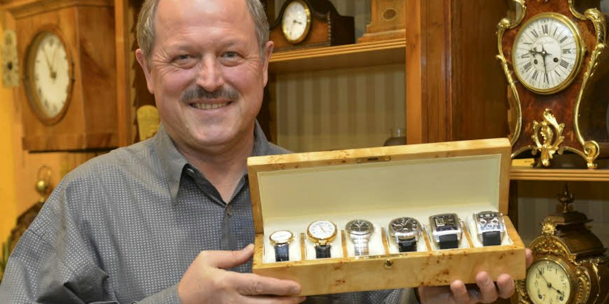 Hartmut Last präsentiert eine Auswahl seiner Uhren in seinem Geschäft in der Grünen Ladenstadt.