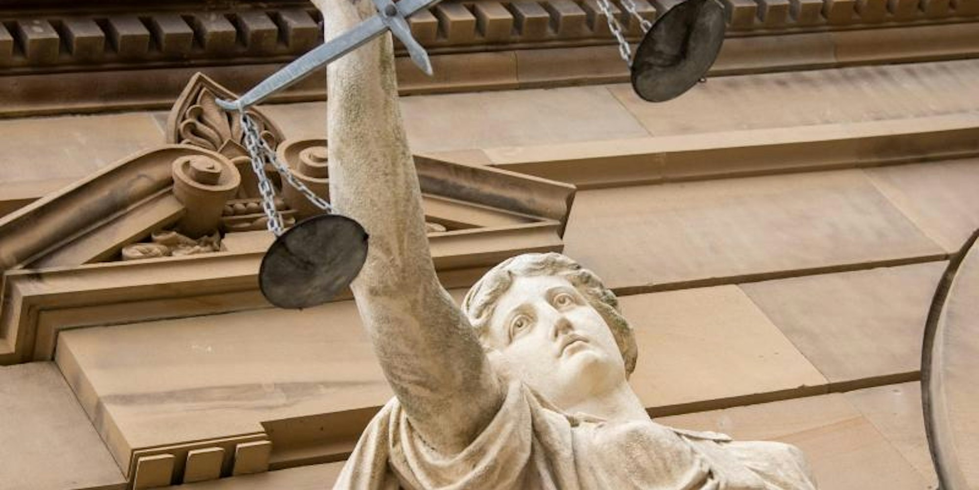 Vor dem Landgericht hält eine Statue der Justitia eine Waagschale.