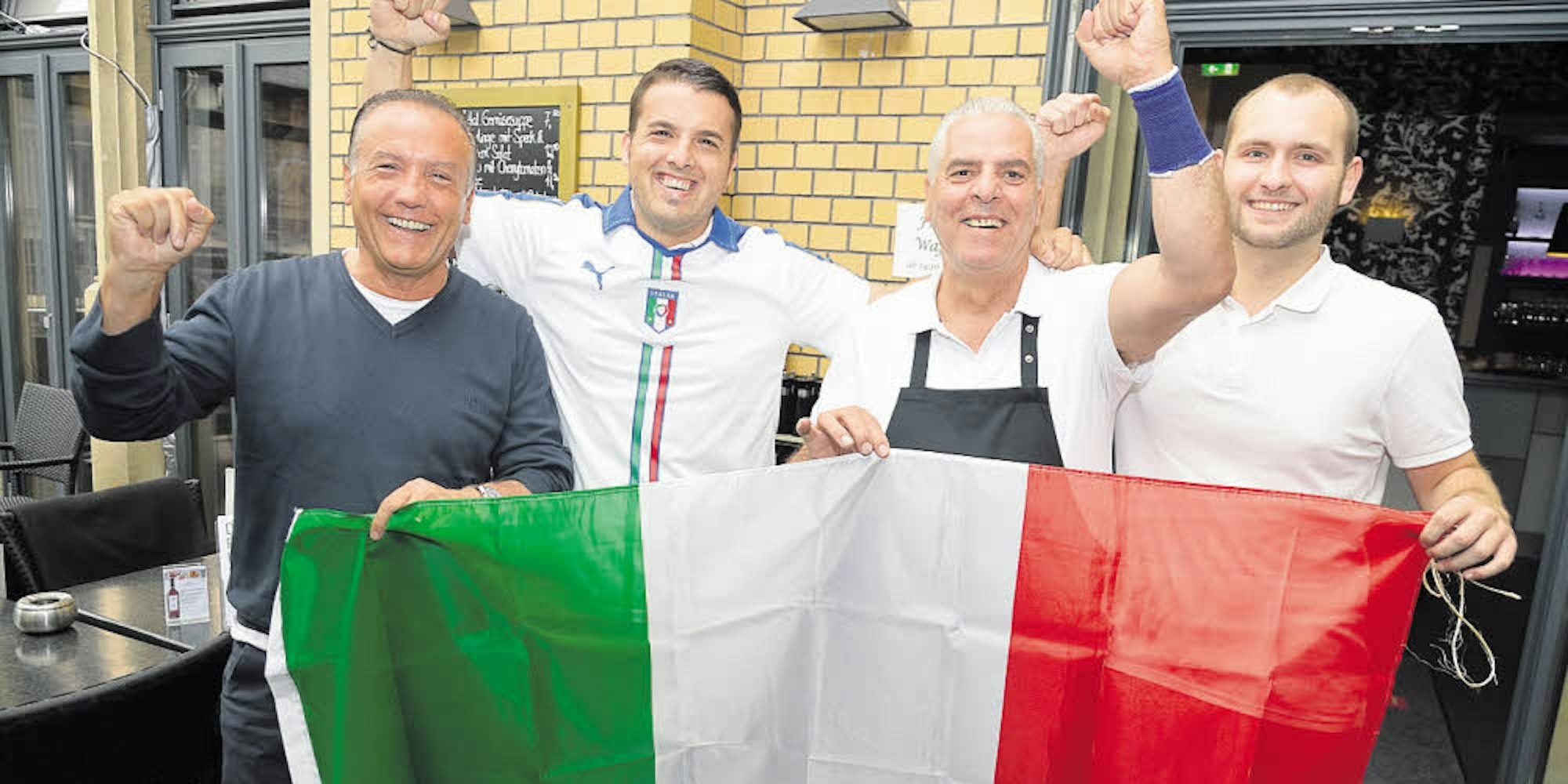 Das Team des Alten Pastorats freut sich auf die Begegnung Italien – Deutschland. Emilio Lattarulo, Pietro Lattarulo, Mimmo Puntillo und Tommaso De Stefano (v.l.) werden jedoch nur bei der Arbeit den Bildschirm beobachten.