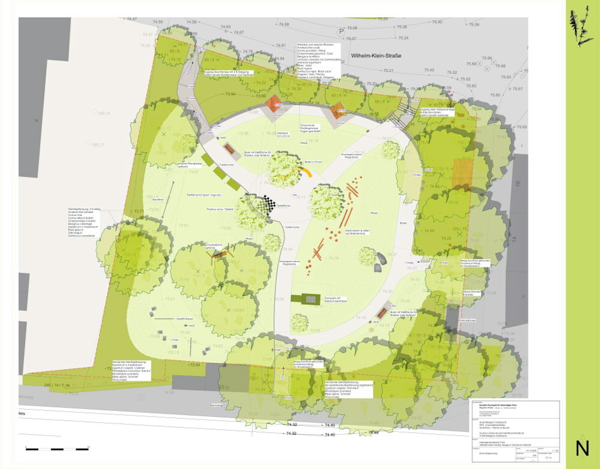 Im Konzept von Stadtgrün soll die Grünanlage mittels Bepflanzung aufgewertet werden und unterschiedliche Ausstattungselemente bekommen. Elemente wie Holz und Stein, eine artenreiche Bepflanzung und eine extensive Blühwiese gehören ebenfalls zum naturnahen Konzept der Bergisch Gladbacher „Stadtgärtner“.