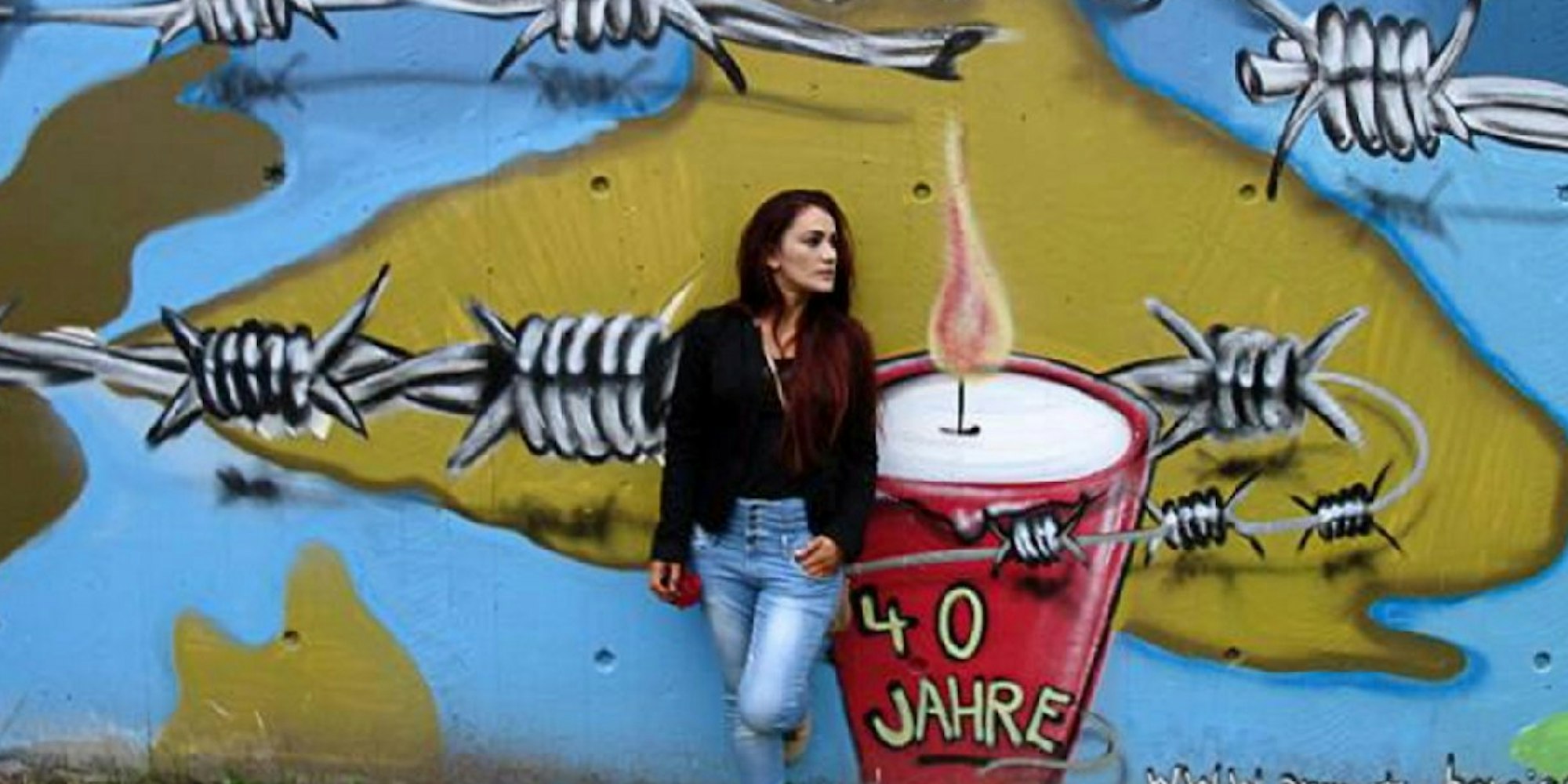 Sinnbild: Eine junge syrische Frau vor dem Graffito in der Gladbacher Innenstadt, das zum 40. Jahrestag von Amnesty International entstand.