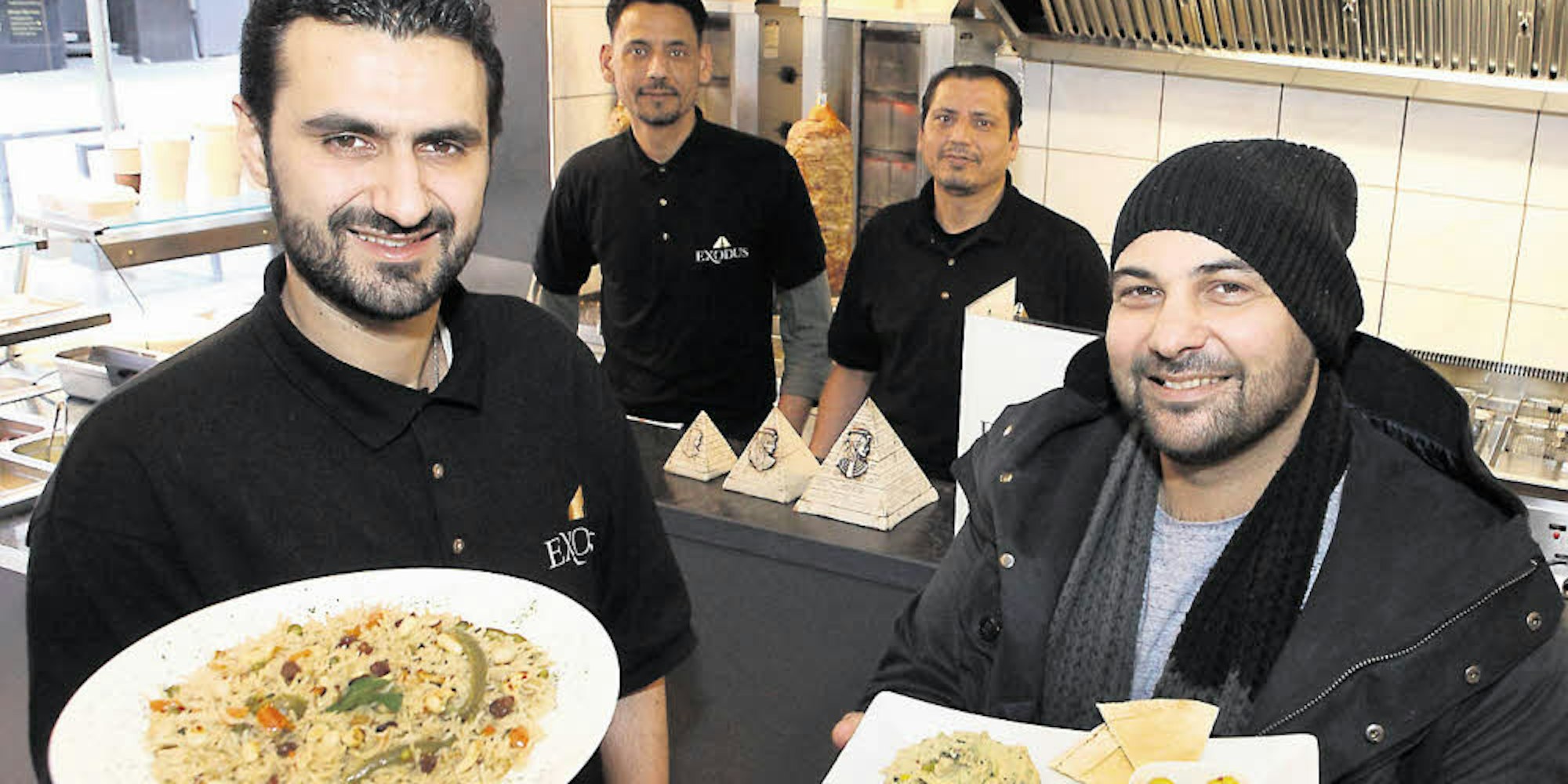 Sein Restaurant „Exodus“ betreibt Inhaber Kaan Candan (r.) mit (v. l.) Nima Firouzi, Mudasser Shah und Qadeer Shah. Die Speisen im Vordergrund: vegetarisches Kabsa (l.) und „Mezze“ (Vorspeisen).