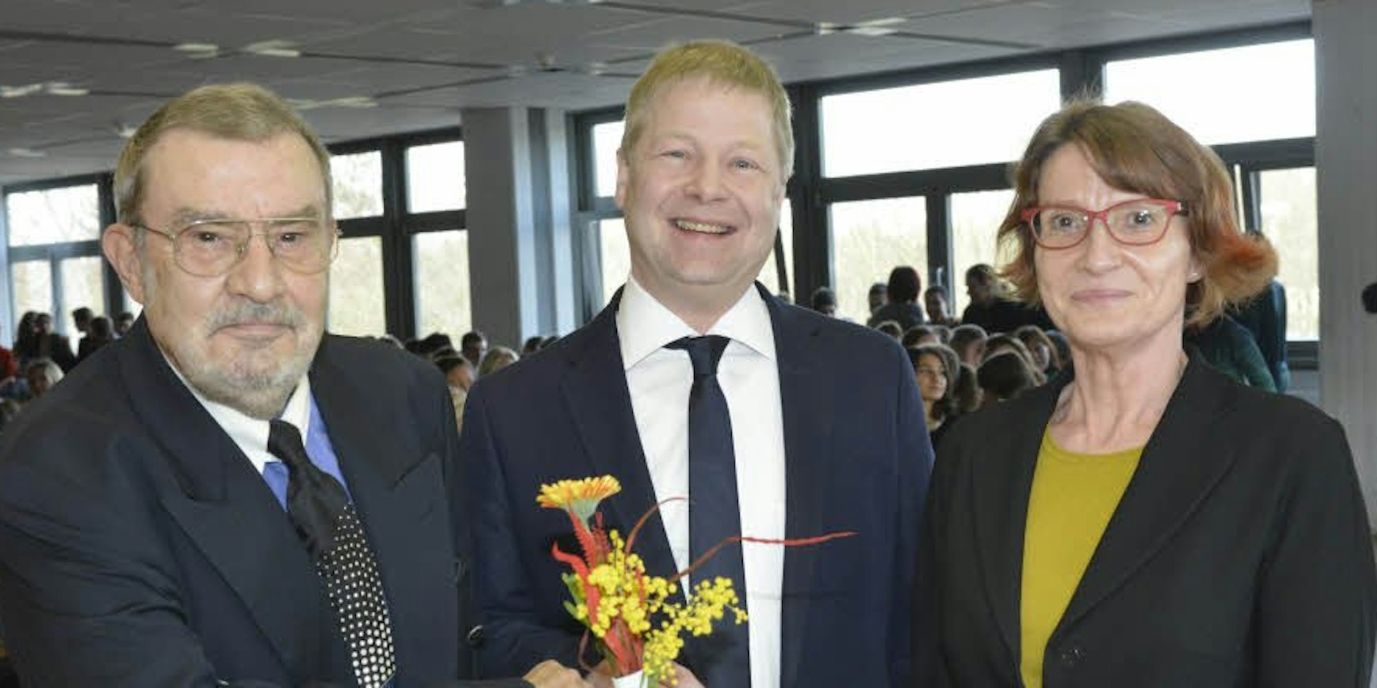 Einführung des neuen Schulleiters Felix Bertenrath (M.) an der Otto-Hahn-Realschule mit Hans-Egon Sternberg und Iris Zillinger.