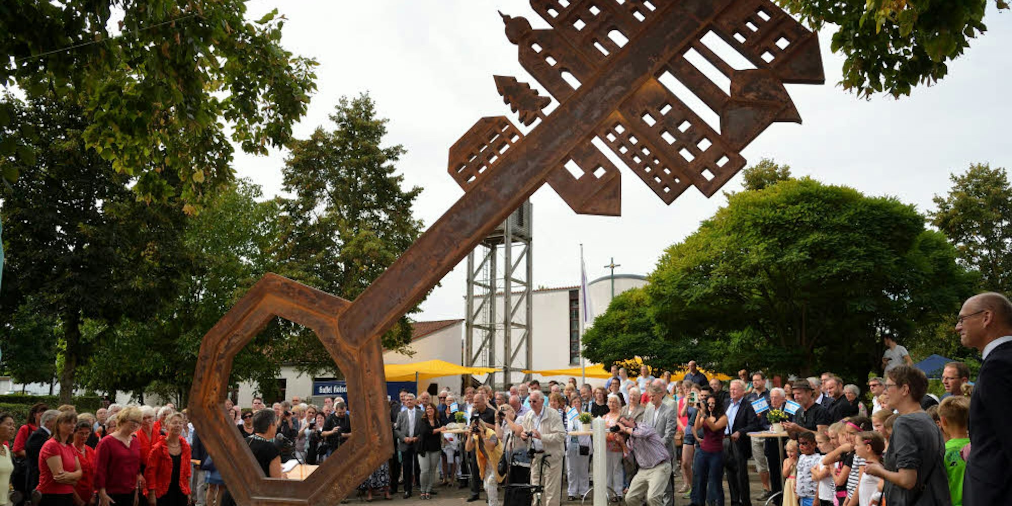 Der zwei Meter große, rostfarbene Schlüssel, der von der israelischen Bildhauerin Orna Ben-Ami geschaffen wurde, besteht aus den Silhouetten der beiden Städte Gladbach und Ganey Tikva.