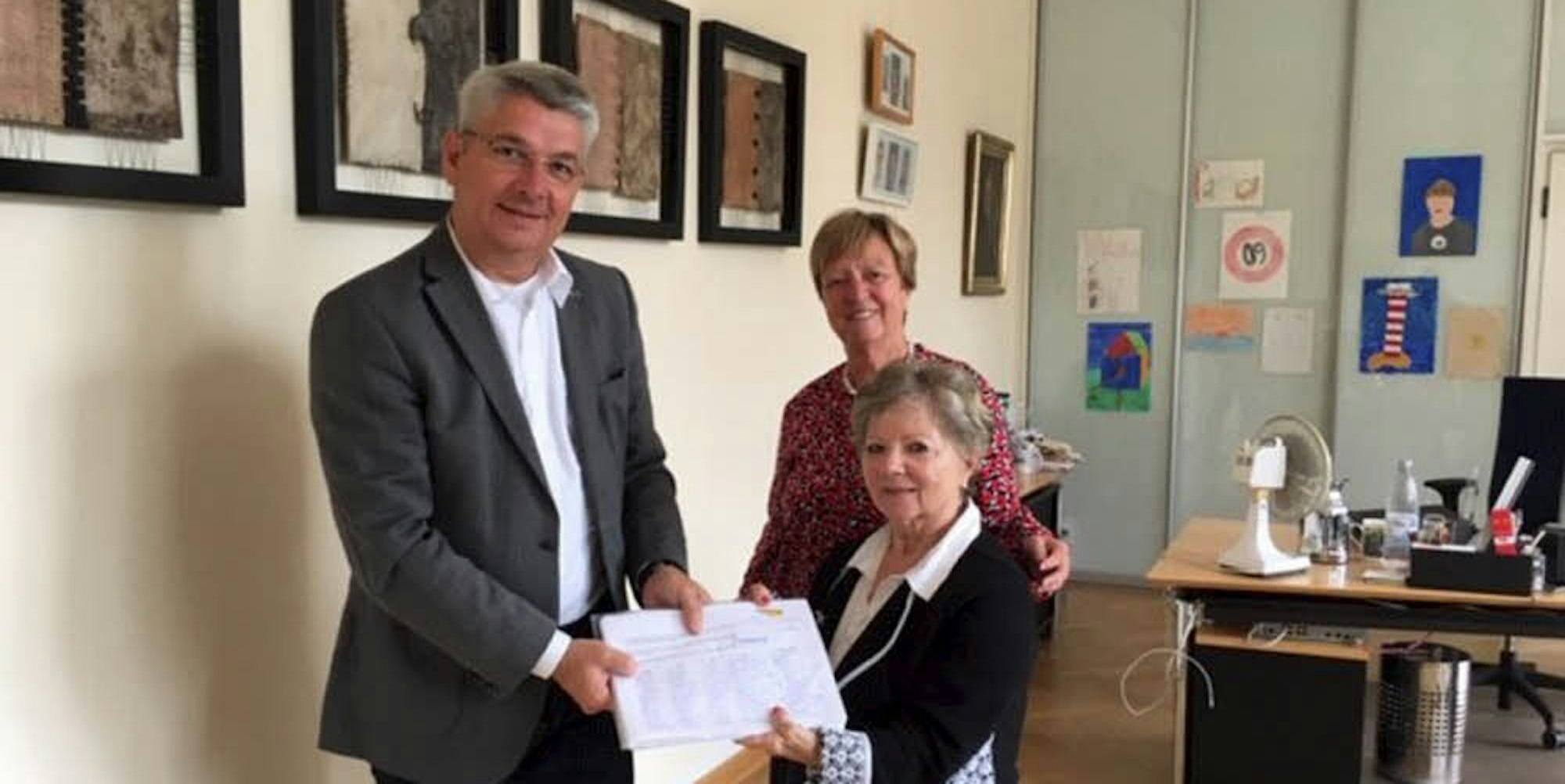 Hildegard Linde (Mitte) überreicht ihre Unterschriftenliste in Begleitung von Maria Thersia Opladen an Lutz Urbach.