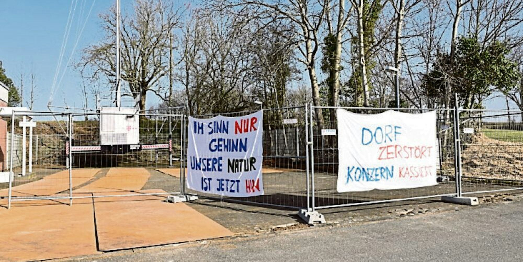 Sie machen weiter, die Anwohner der Siedlung Neuenhaus: Am Bauzaun flattern Banner aus Protest gegen den Funkmast.