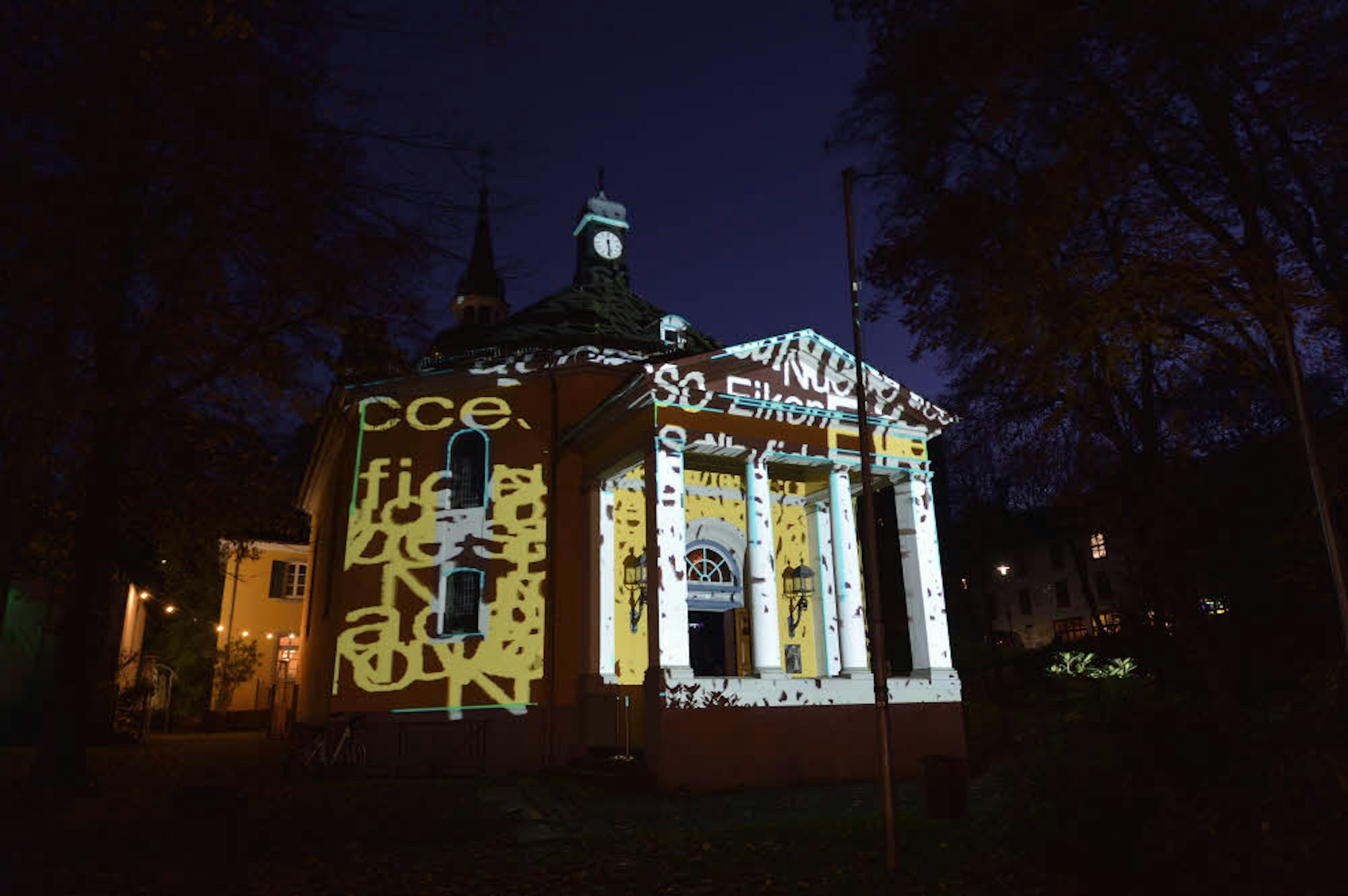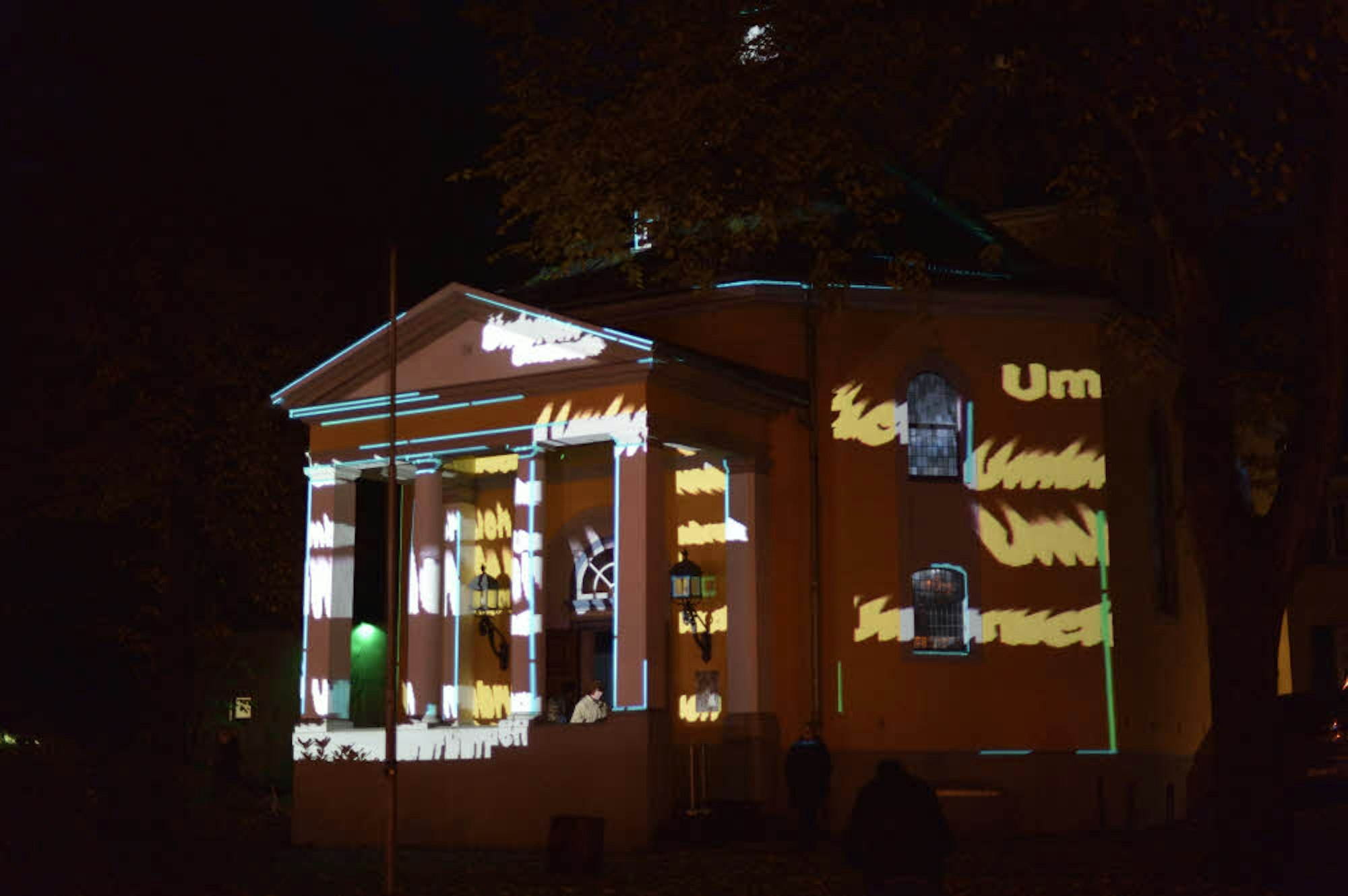 Bei Einbruch der Dunkelheit begann ein ungewöhnlicher Dialog mit der Architektur, mit Geschichte und Religion, mit Glauben und Zweifel im öffentlichen Raum. Die Videoinstallation ergoss Gnade in Großbuchstaben über die Fassade, ließ bei der Erwähnung von Hölle und Hass die Säulen erzittern und projizierte ein Bild von Kirche im Umbruch.