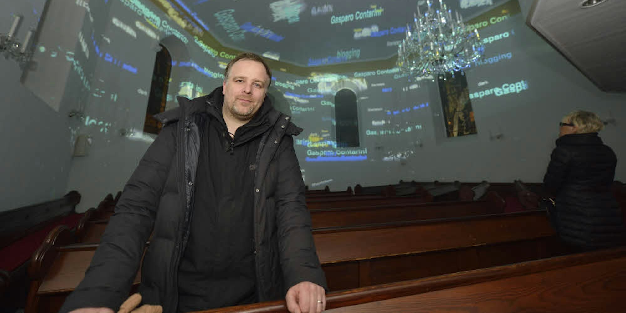 Für seine Arbeiten zum Lutherjahr, die er unter anderem für Venedig und Weilheim konzipiert hat, ist er „komplett in 500 Jahre Reformation eingetaucht“. Drei kleine Beamer hat Geist auf der Empore in der Kirche installiert, einen großen im Außenbereich; Lautsprecher inklusive, die die virtuellen Wandmalereien mit Musik untermalen.
