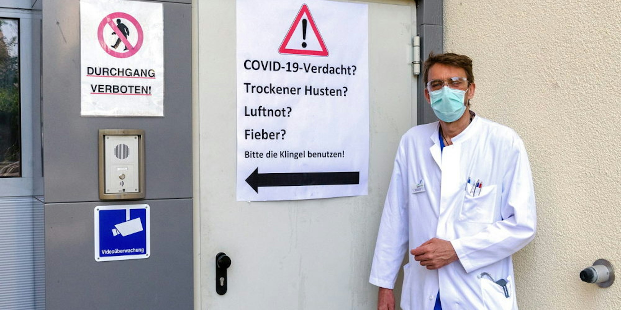 Vor dem separaten Eingang des EVK steht Dr. Benjamin Stüttgen, Leiter der zentralen Notaufnahme.