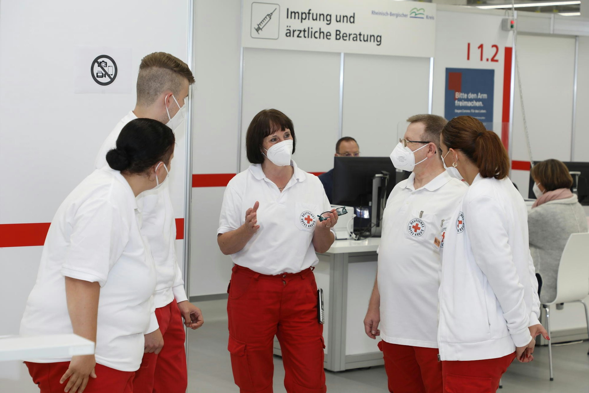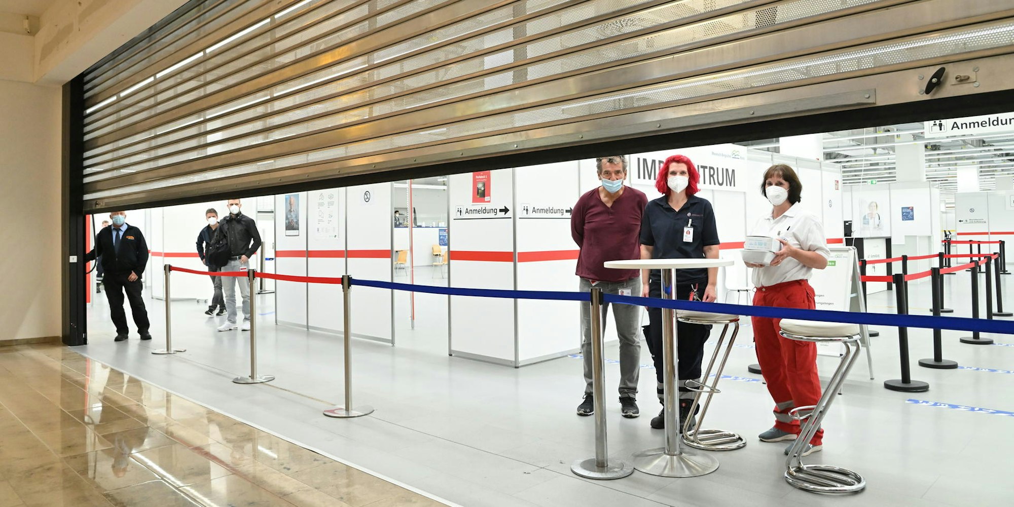 Ein starkes Team: DRK-Kreisvorsitzende Ingeborg Schmidt (M.) mit DRK-Mitarbeitenden am Empfang des Gladbacher Impfzentrums.
