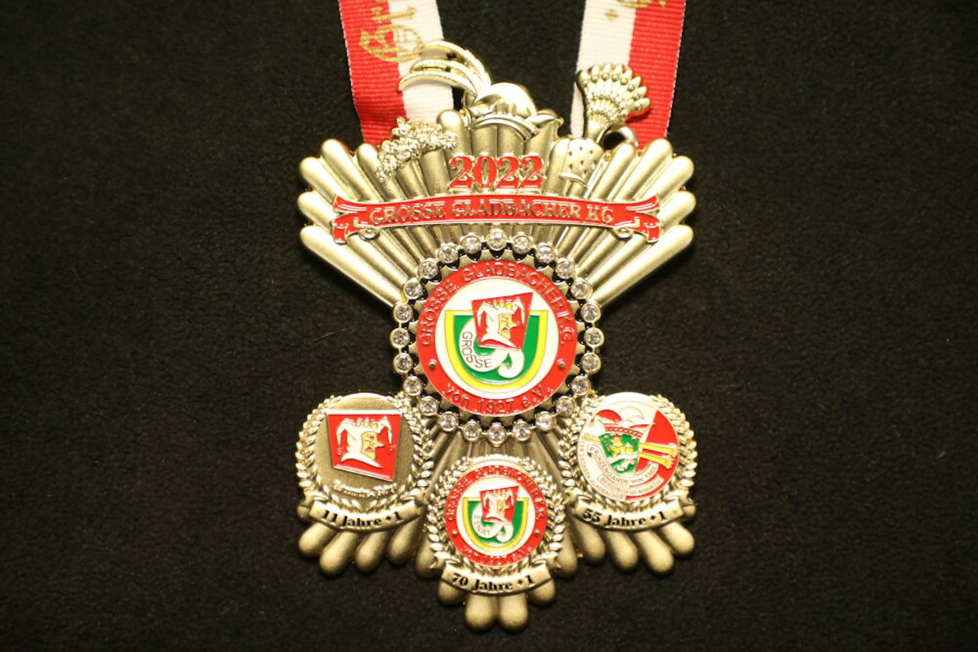 Nicht nur die Sessionsorden für die Muttergesellschaft des designierten Dreigestirns, die Große Gladbacher KG, waren bereits fertig, sondern auch die Orden, die die Tollitäten in dieser Session verleihen wollten. Sie alle stapeln sich nun in Kartons beim Präsidenten der Karnevalsgesellschaft und der Jungfrau des Dreigestirns, seitdem auch diese Session von der Pandemie ausgebremst worden ist. Während der Sessionsorden der Großen Gladbacher KG wie berichtet doch bei der einen oder anderen Gelegenheit verliehen werden kann, bleiben die Dreigestirnsorden unter Verschluss. Schließlich soll die Gestaltung geheim bleiben. Der Orden der Großen Gladbacher KG nimmt die bereits um ein Jahr verschobenen Jubiläen der Gesellschaft auf und zeigt neben dem Emblem der Gesellschaft auch die der KG-„Säulen“ Senat (70 Jahre), Prinzengarde (55 Jahre) und Strunde-Pänz. „Nächstes Jahr feiern wir die Jubiläen dann »plus 2«“, kündigt Präsident Alexander Pfister augenzwinkernd an. (wg)