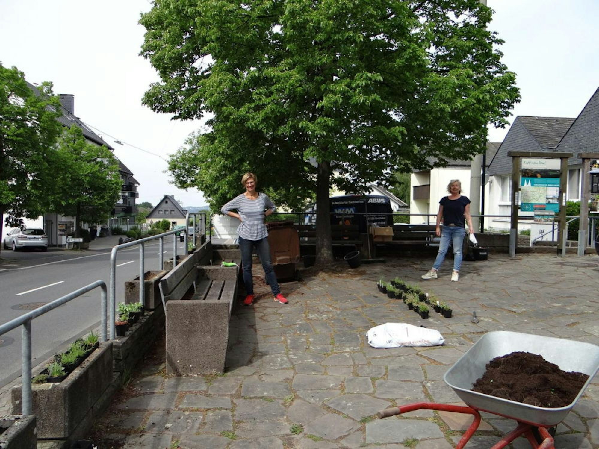 Manuela Thomas bepflanzt zusammen mit Claudia Krieger die Kübel auf dem Kirchvorplatz.