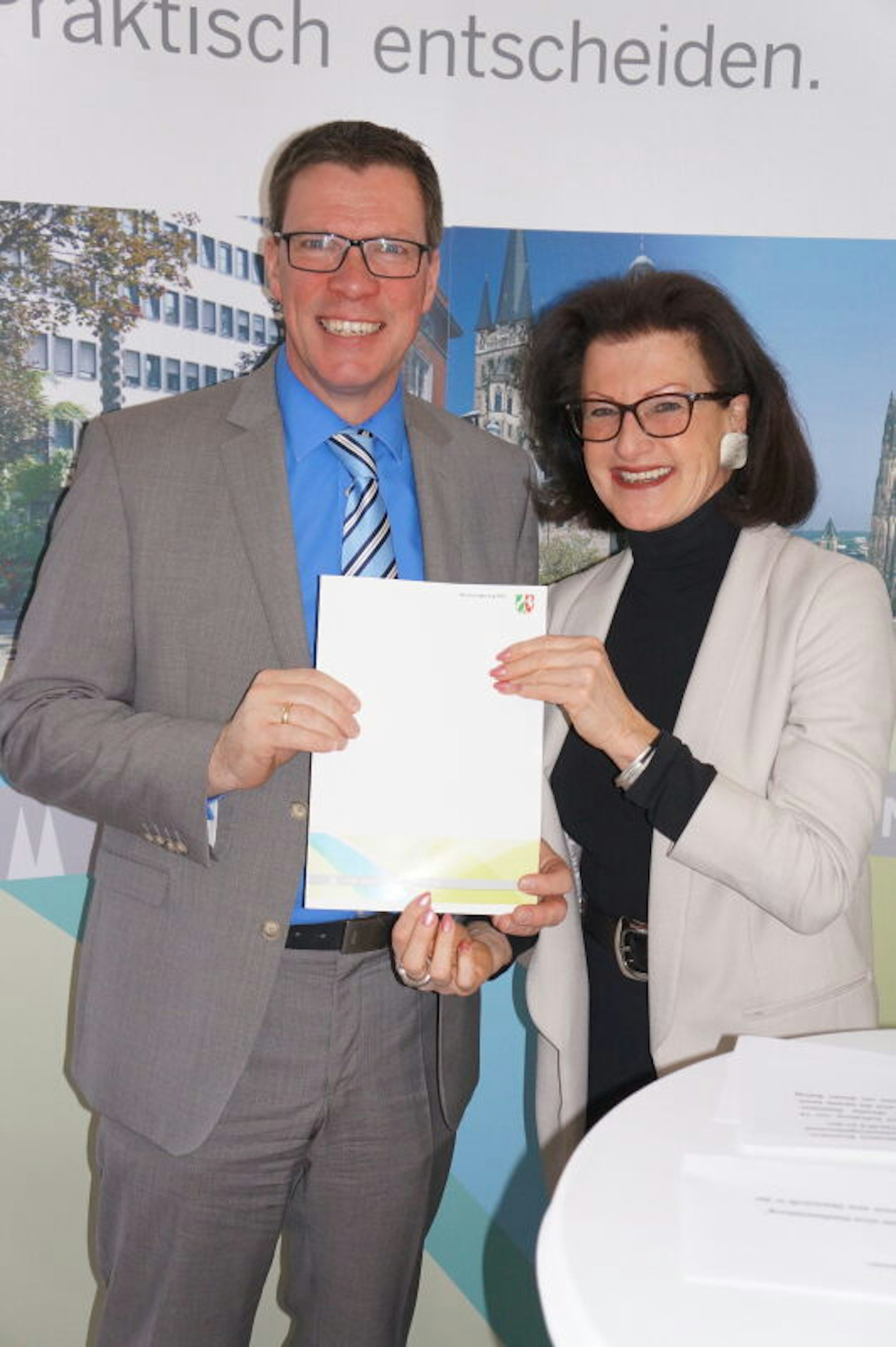2019: Landrat Santelmann und RP Gisela Walsken mit Förderbescheid über fünf Millionen Euro.
