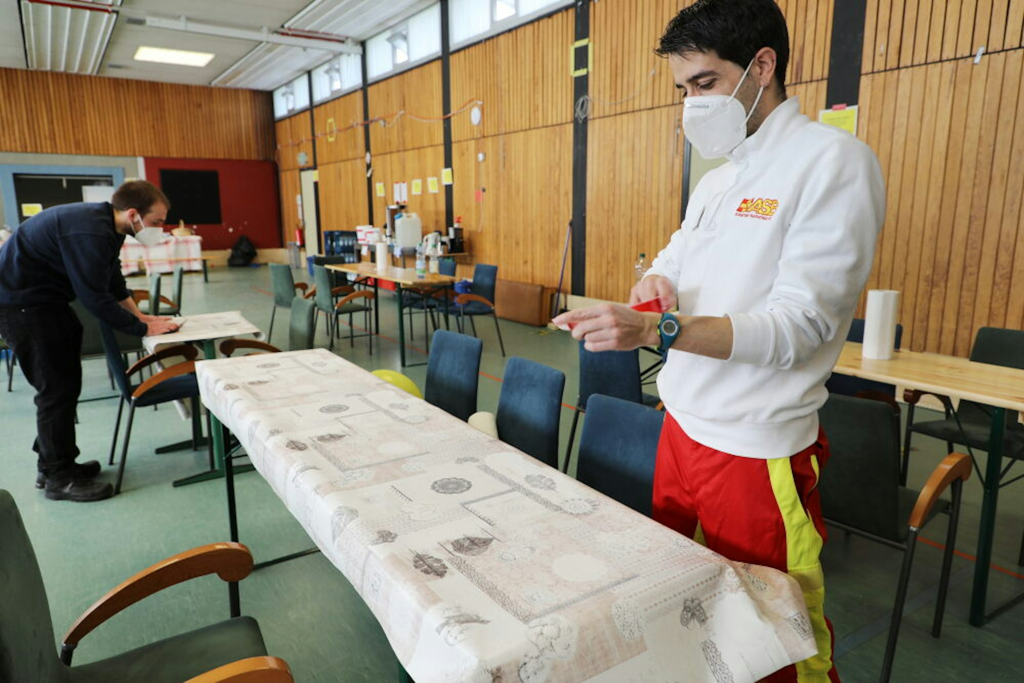 Im Aufenthaltsraum der Bergisch Gladbacher Erstaufnahmestelle an der Saaler Mühle verteilen in dem Hermández Rivero (r.) und Oliver Bayer vom Arbeiter Samariterbuns (ASB) Tischdecken.