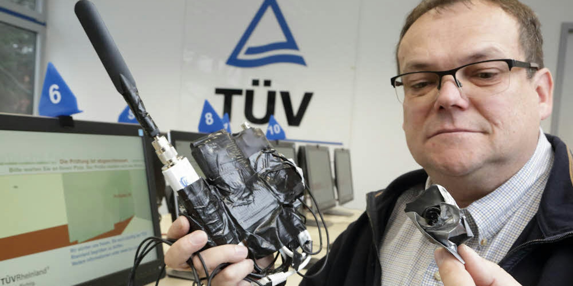 Tüv-Mitarbeiter Markus Hupperten zeigt einen Minisender, über den die Prüfungsteilnehmer sich die Antworten einflüstern lassen.