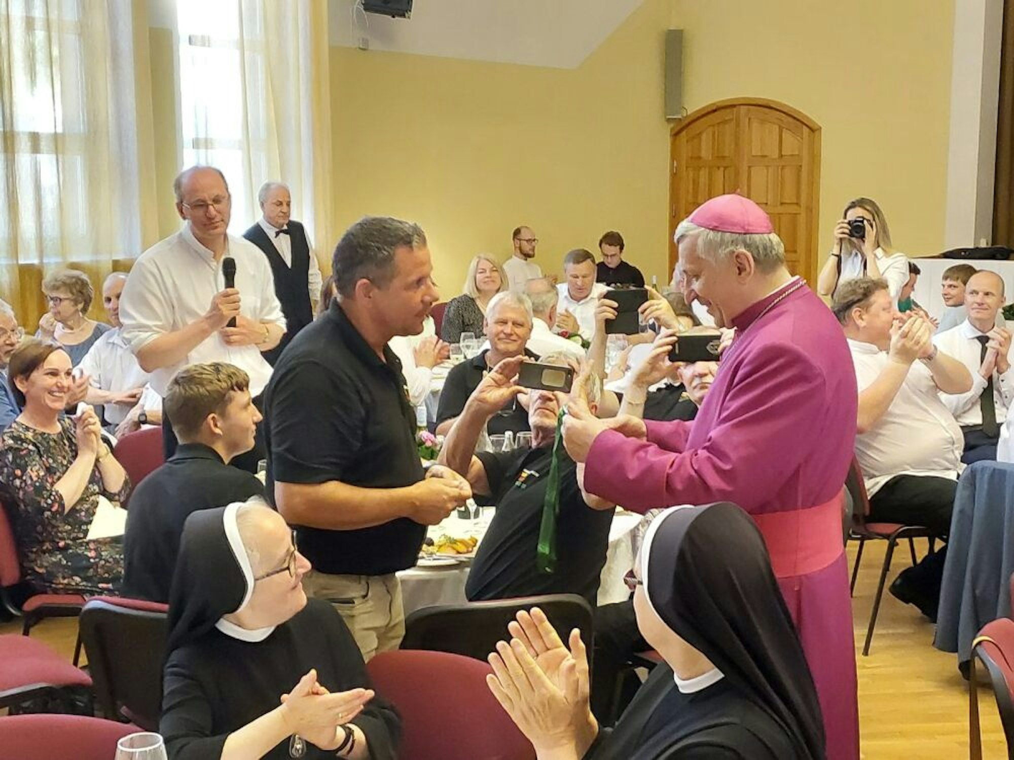 Nach der Festmesse übergab Dietmar Schur einen für den Bischof gedrechselten Engel und Ulrich Gürster im Auftrag der Karnevalsgesellschaft Löstige Stänedräjer auch deren Karnevalsorden. Auch Pfarrer Arvydas erhielt den Orden mit besten Grüßen vom Präsidenten der KG Löstige Stänedräjer, Dietmar Köster. Beide verbindet eine tiefe Freundschaft.